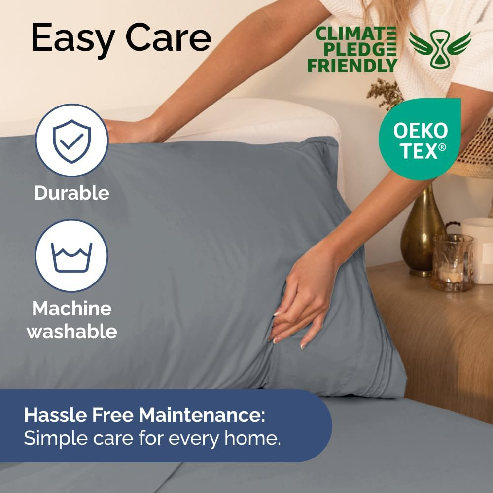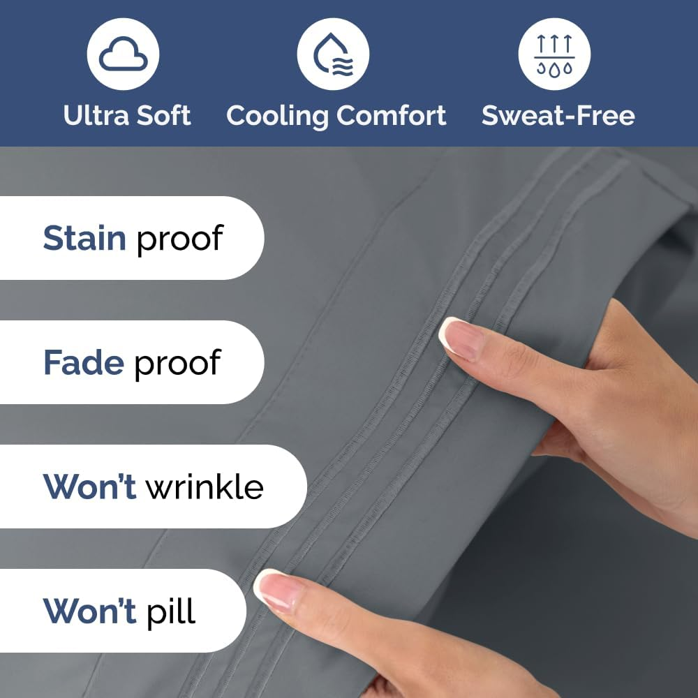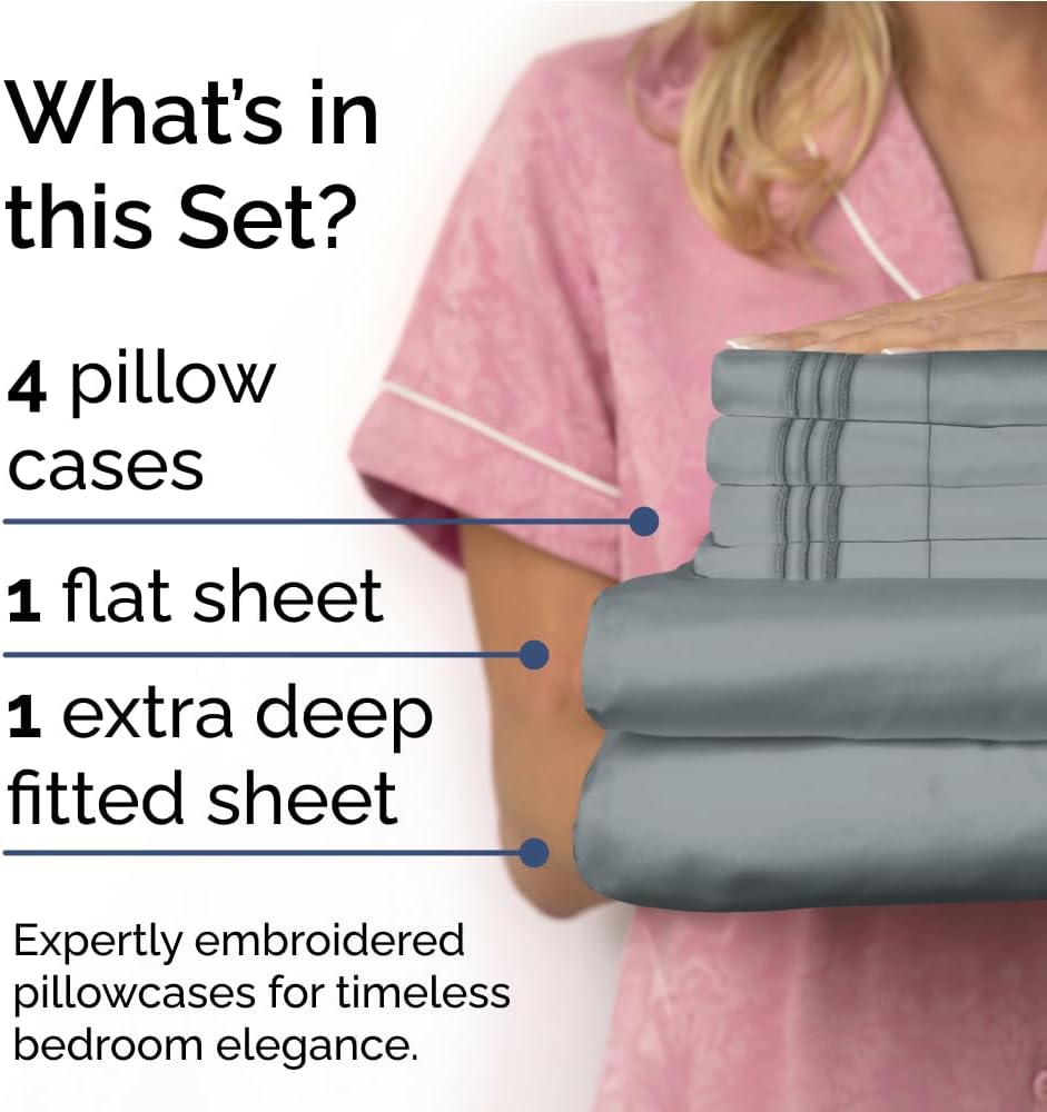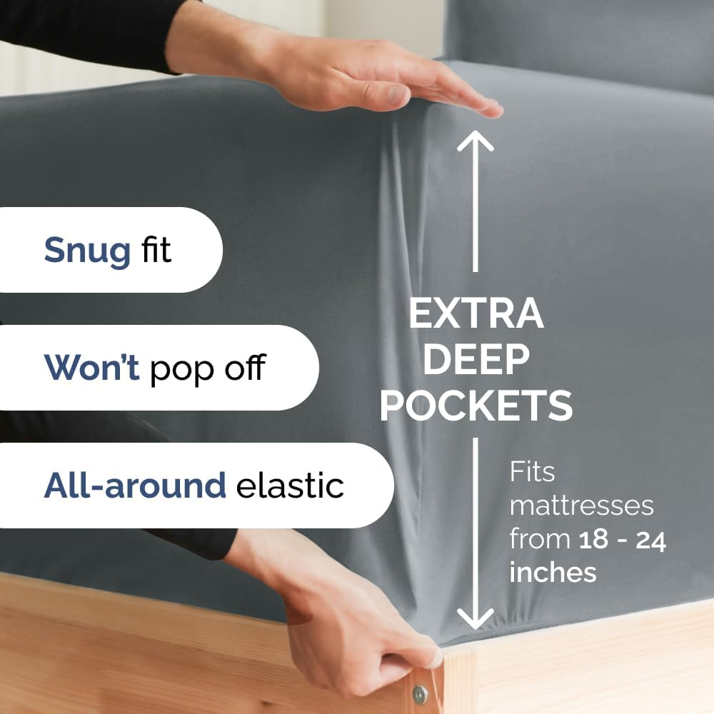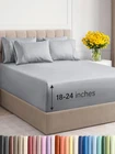 EXTRA DEEP POCKET KING SHEETS / EXTRA DEEP FITTED KING SHEETS: These bed sheets are for very deep pocket mattresses. They fit any mattress with pockets that are 18, 20, 21, 22 and 24 inches deep. There's stretchable elastic around the extra deep fitted sheet which stretches for a nice tug around your mattress. Perfect for extra tall & large mattresses. Rest assured these oversized sheets will stay on tight & stay in place! 6 PIECE SHEET SET: This bed sheet set comes with 4 pillowcases total all with a beautiful decorative embroidery design on each pillow case. The pillow cases have enclosure designs. This bedding set will accommodate your extra thick mattress perfectly. GREAT FOR DOUBLE PILLOW TOP MATTRESS: These bed sheets are perfect for mattresses with a 3 inch or 4 inch topper on top, memory foam toppers, big mattress pads, pillow tops, foam toppers, big foam toppers, pillow top mattresses and memory foam. These sheets will not come off. MICROFIBER: These are the softest type of microfiber bed sheets we have created. Super soft with a light feel. Not crisp like cotton. If you're accustomed to cotton sheets and you've never tried microfiber sheets we recommend you give these a try. They're even softer than cotton! DIMENSIONS & SIZES: Flat Sheet 111 wide and 102 long. Fitted sheet 78 wide and 80 long with 21 inch pockets (has elastic so it can stretch). All four pillow cases are oversized 20 x 40 inch. Product Description The video showcases the product in use. The video guides you through product setup. The video compares multiple products. The video shows the product being unpacked. Shop the CGK Linens catalog of luxury bedding products Add to Cart Add to Cart Add to Cart Add to Cart Customer Reviews 4.4 out of 5 stars 83,271 4.6 out of 5 stars 45,104 4.3 out of 5 stars 3,117 4.7 out of 5 stars 36 Price $59.99 $ 59 . 99 $13.99 $ 13 . 99 $49.99 $ 49 . 99 $192.00 $ 192 . 00 Fits Sizes 18 to 24 Inch Mattress 30" Length x 19" Height Twin, Full, Queen, King 18 to 24 Inch Mattress Triple Embroidered Pillowcases Triple Embroidered Triple Embroidered X Triple Embroidered Envelope Enclosure Pillowcases Envelope Enclosure Envelope Enclosure X Envelope Enclosure OEKO-TEX Certified Yes Yes Yes Yes Product Care Machine Wash Machine Wash Machine Wash Machine Wash Wrinkle Proof Yes Yes Yes Yes Fade Proof Yes Yes Yes Yes Stain Proof Yes Yes Yes Yes