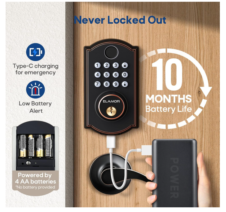 Advanced Fingerprint Unlock: Equipped with cutting-edge biometric recognition, our smart door lock identifies fingerprints in 0.3 seconds and unlocks in 1 second with a 99.99% accuracy rate, ensuring fast and reliable access. 3-in-1 Keyless Unlock: Our fingerprint door lock with 2 Lever handles supports up to 100 fingerprints and 50 PIN codes, perfect for large families or shared spaces. It includes 2 backup keys for emergencies, and no app or Wi-Fi is needed—your finger is the key to unlocking. Auto Lock & One-Touch Locking: The automatic locking feature secures your door 5–30 seconds after unlocking, ensuring safety even if you're distracted. One-touch locking adds convenience for quick and secure closure. Durable & Long-Lasting: Built with a robust aluminum alloy, IP54 waterproofing, and a durable lock cylinder, the front door handle sets includes a low-battery LED indicator and emergency USB Type-C power supply, offering lasting reliability and protection. Easy to Install: Install in minutes with a basic screwdriver. The adjustable design fits most door frames, with a center distance range of 2-3/8" (60mm) to 2-3/4" (70mm) for seamless integration.