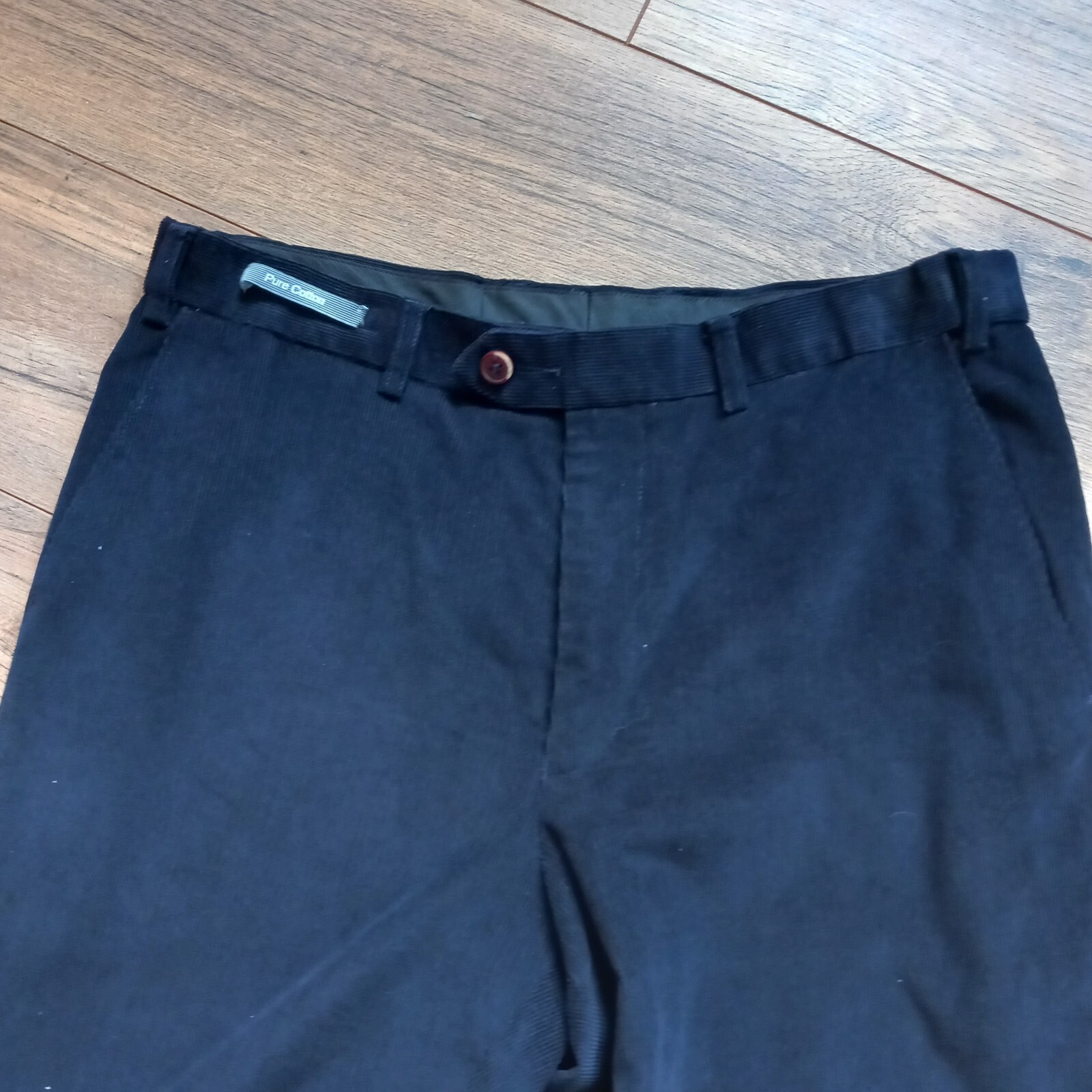 Dont think these were actually ever worn but the tags are removed - cotton label still on the front. Dark blue fine cord trousers in classic design from M&S Man. Measures 16" across waist, 30" long inside leg. 100% cotton.