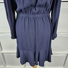 M&S navy long sleeve dress, size 14. Pretty dress with elasticated waistband and cuffs, button down top, and A-line skirt with a flare hem. Versatile style, suitable for daytime, work or dressed up for an evening out. In good used condition. Approximate Measurements in inches: Armpit to armpit: 20 Waist: 14 laid flat, stretches to 19 Length: 34