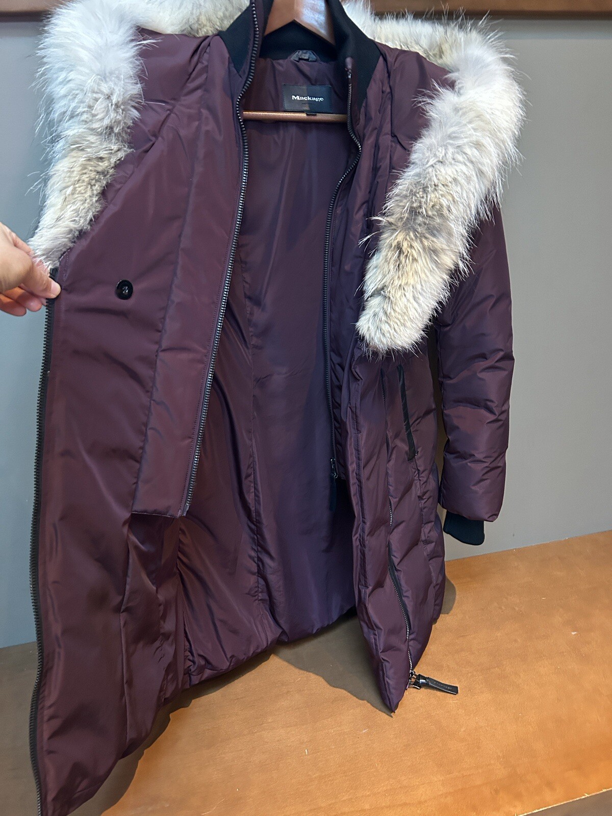 Stay warm and stylish with this Mackage Down Burgundy Coat in size X-small. Made with high-quality polyester outer shell and cozy down insulation, this parka is perfect for tackling cold winter days. Featuring a luxurious coyote fur trim and a flattering burgundy color, this coat is a must-have for any fashion-forward woman's wardrobe. Perfect for everyday wear or special occasions, this coat combines practicality and elegance effortlessly. Please see picture with green circles. One area with some dark discoloration, but not highly noticeable. Another area with light areas that maybe dry cleaning can clear. Model in photo is too big for the jacket! :-) But for perspective, model is 5’3” and about 135 pounds.
