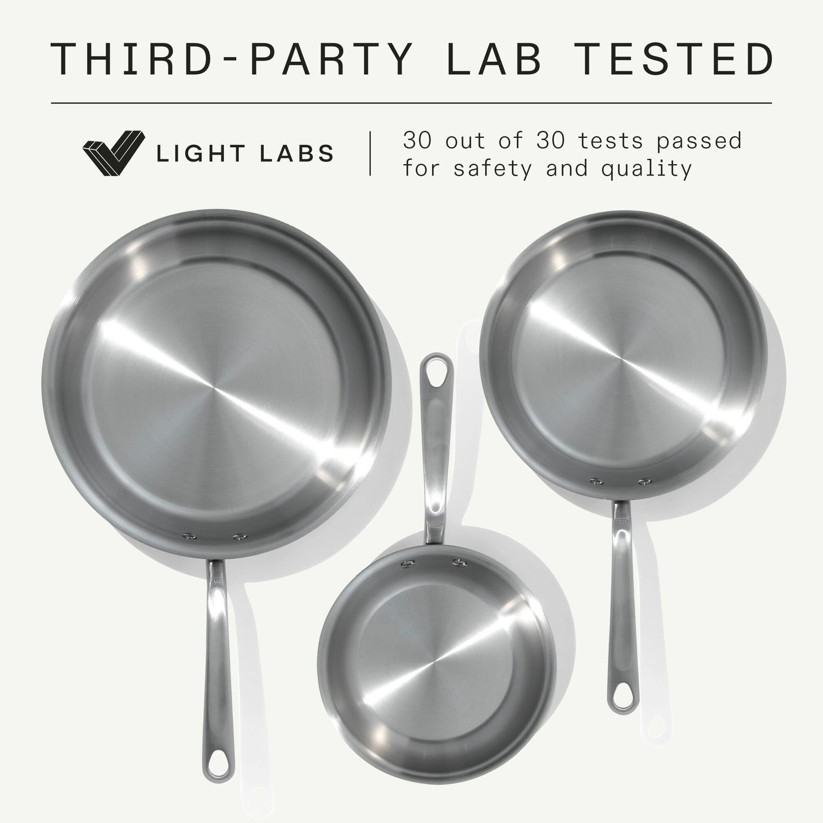 Made In Cookware - 3-Piece 3 Piece Set Includes 8",10",12", Stainless Steel Product Details Includes: 8" Stainless Frying Pan | 10" Stainless Frying Pan | 12" Stainless Frying Pan Essential for Every Kitchen - The Made In Stainless Clad Frying Pan is a must-have kitchen tool, offering maximum heat control, responsiveness, and versatility to elevate your cooking experience Superior Quality - Made from 5 layers of premium metal for professional-quality heat distribution Stay Cool Handle - Meticulously crafted to stay cool while cooking and fastened with stainless steel rivets for a lifetime of use Induction Cooktop Compatible - With a top layer of 430 stainless steel, these Stainless Clad Pots and Pans work effortlessly with any cooktop, including induction