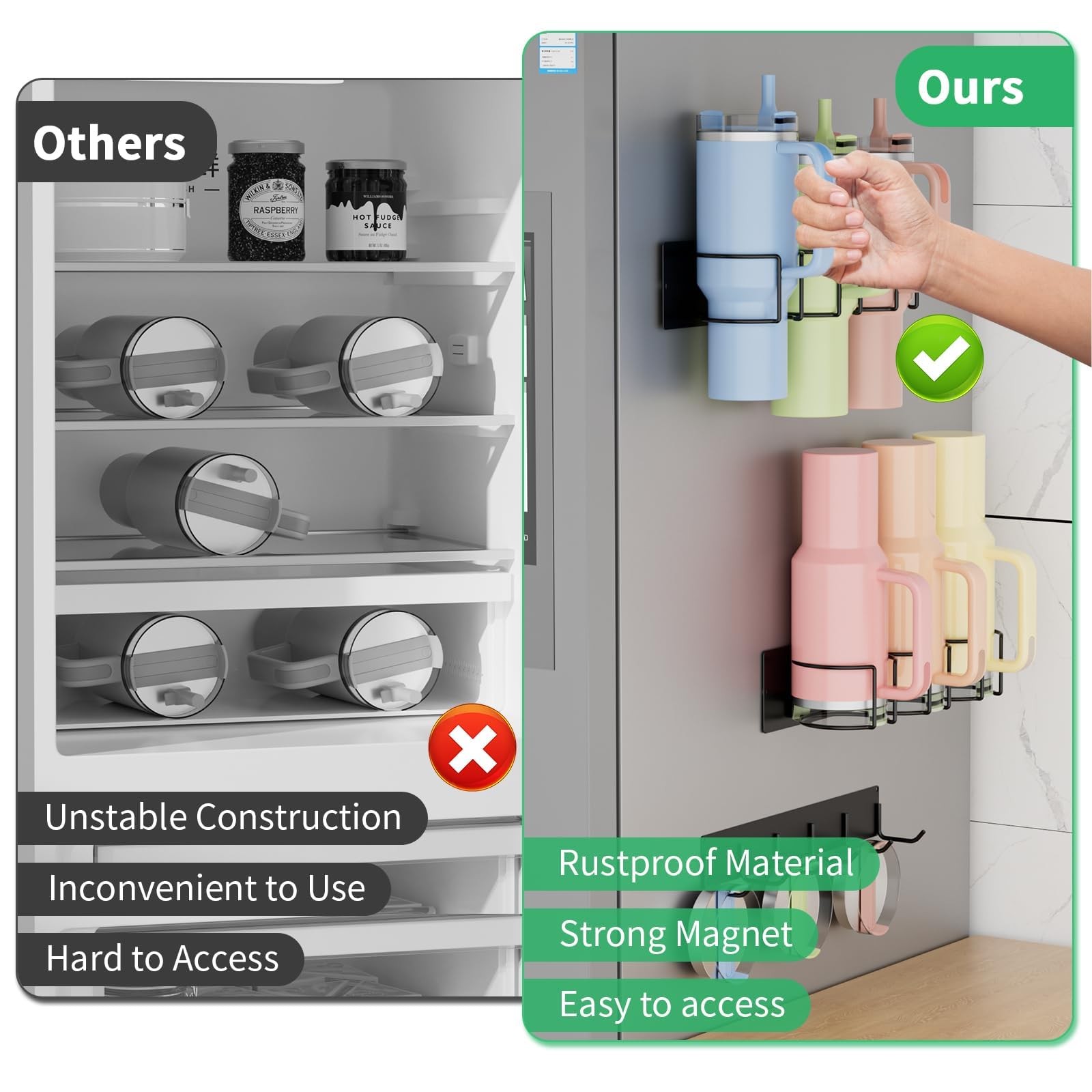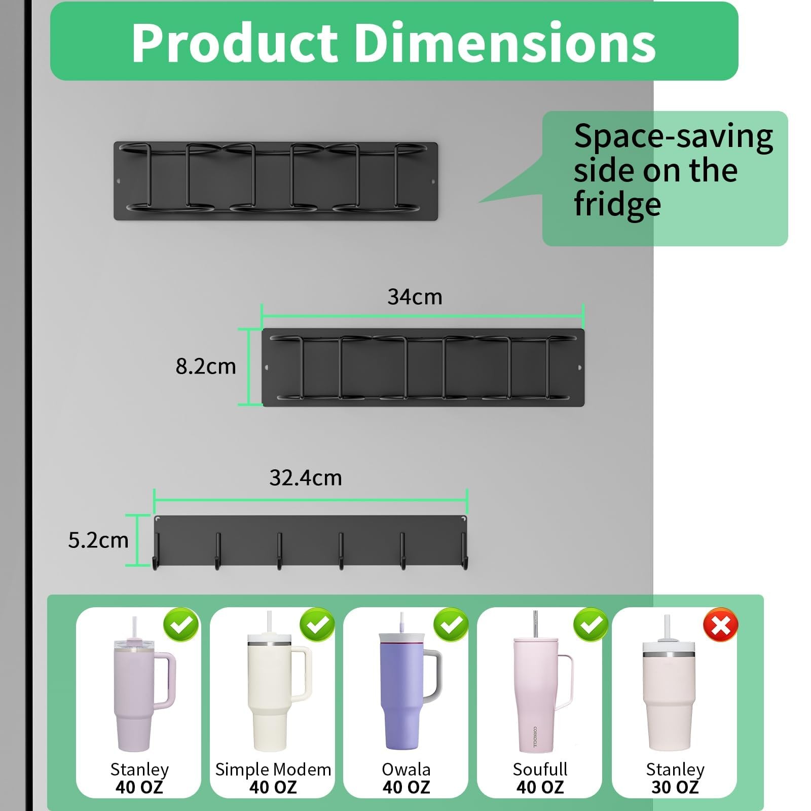 Never Search for Your Stanley Again! Organize Your Kitchen with Powerful Magnetic Holders! Tired of your Stanley tumblers, Yeti cups, or favorite mugs cluttering your countertops or rolling around in the cabinet? Our innovative Stanley Cup Holder Set is the ultimate space-saving solution for your kitchen, garage, or workshop! The Perfect Stanley Tumbler Companion (and More!): Designed specifically with the popular Stanley Quencher and other similar-sized tumblers in mind, these sturdy holders securely cradle your 30 oz, 40 oz, or other large Stanley tumblers, water bottles, travel mugs, coffee cups, and drinkware. Keep them upright, accessible, and ready to grab-and-go! Revolutionize Your Fridge Organization with Super Strong Magnets! The game-changing feature? Each holder and the included utility hook features powerful built-in magnets embedded directly on the back. Simply place them onto any smooth metal surface – like your refrigerator, freezer, metal cabinet, toolbox, filing cabinet, or garage door – and they snap securely into place! No drilling, no tools, no damage – instant magnetic organization! The Complete 3-Piece Set for Ultimate Convenience: Get more organized with our versatile set, which includes: Two (2) Heavy-Duty Cup Holders: Perfect for your Stanley tumblers, large water bottles, or travel mugs. Free up valuable counter and cabinet space. One (1) Multi-Purpose Magnetic Hook: Ideal for hanging oven mitts, kitchen towels, aprons, keys, utensils, small tools, or even reusable shopping bags. Maximize your vertical storage! Upgrade Your Home & Kitchen Storage Today! Stop the clutter and start enjoying a more organized, efficient space. This magnetic Stanley cup holder set is the smart, easy, and damage-free way to add instant storage and organization anywhere you have a metal surface. Get yours now and experience the convenience of magnetic kitchen accessories! 【Strong Magnetic Cup Holder for Stanley】This tumbler organizer for fridge equipped with a really strong and heavy-duty magnet. ensuring your Stanley 40-oz water bottle is always within easy reach and won't fall off easily. Perfectly fitting up to other popular 40 oz water bottles with handle 【High-quality Materials】Our Stanley storage organizer is made of made of sturdy carbon steel for long-lasting use. Built-in strong magnets ensure a stable and tight fit to metal surfaces. At the same time, the craftsmanship pays attention to detail processing, the surface is smooth and burr-free, which will not only not scratch the cups, but also is easy to clean, keeping the storage rack neat and beautiful 【Space-Saving Solution】This unique magnetic tumbler organizer features a compact wall-mounted design, that helps you save valuable countertops or storage space. It efficiently organizes up to 6 Stanley 40 oz cups, freeing up valuable counter and cabinet space. The Magnetic hook can be used to store small items such as straw lids, decorations, keys, kitchen tools, etc., to keep them tidy 【Two-Installation Options Available】No tools needed, simply attach magnetic for Stanley organizer, then adsorb it on the refrigerator and you can use it, our magnetic cup storage rack have a strong magnetic holder to securely attached to the side of refrigerator or other iron surfaces, while screws offer a other sturdy and secure finish 【Ideal Present for Organizers】This practical and stylish Stanley cup holder makes an excellent gift for friends and family. In addition to being suitable for Stanley cups, it also has a certain compatibility and can store other cups of similar size. Its combination of functionality and sleek design makes it a thoughtful present for anyone looking to organize their kitchen space efficiently