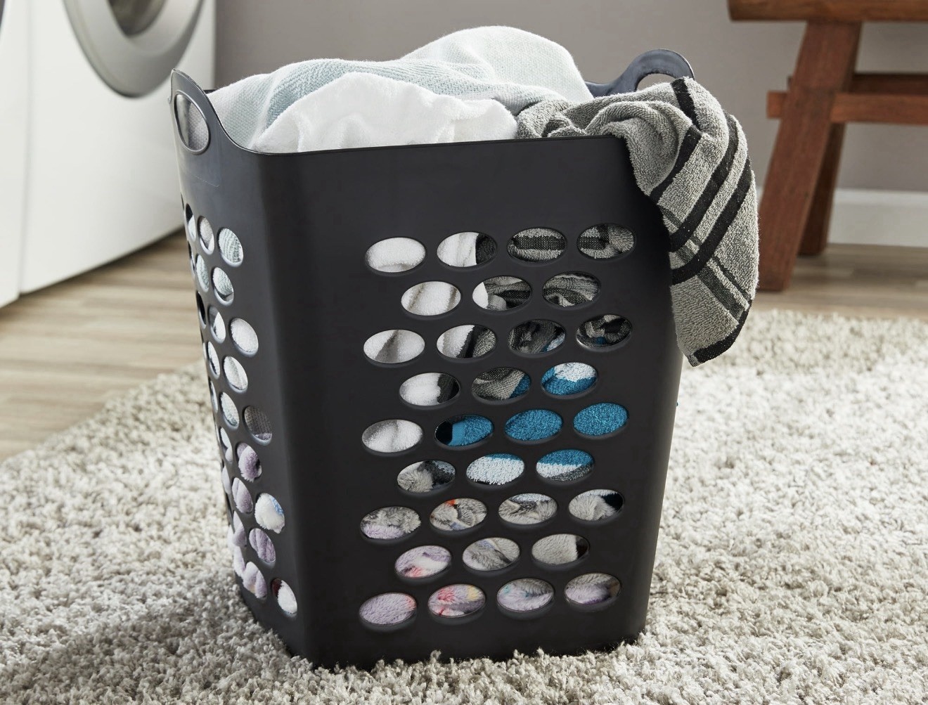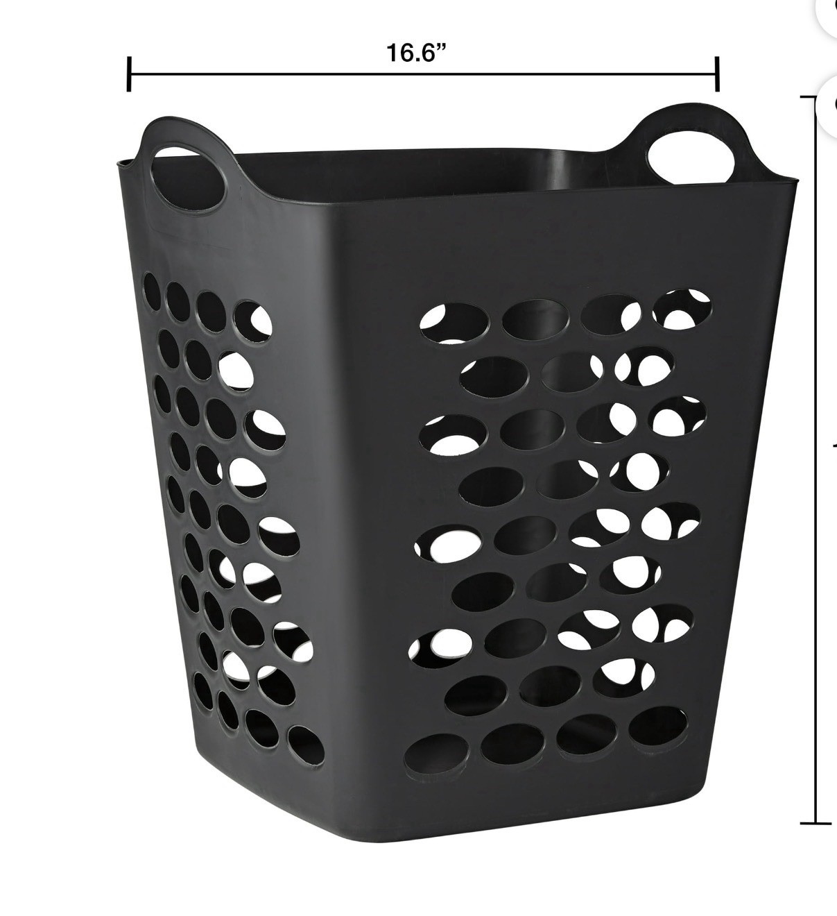 The Mainstays Flex Square Laundry Hamper in black is a modern and stylish addition to any adult's home. Made of durable plastic, this square-shaped hamper features convenient carrying handles for easy transportation. With dimensions of 16.60 x 19.8 x 16.60 inches and a weight of 1.85 pounds, this freestanding hamper is perfect for collecting and storing clothes in a tidy manner. Easy to clean with warm water and mild detergent, this laundry hamper is a practical and efficient solution for keeping laundry organized and out of sight.