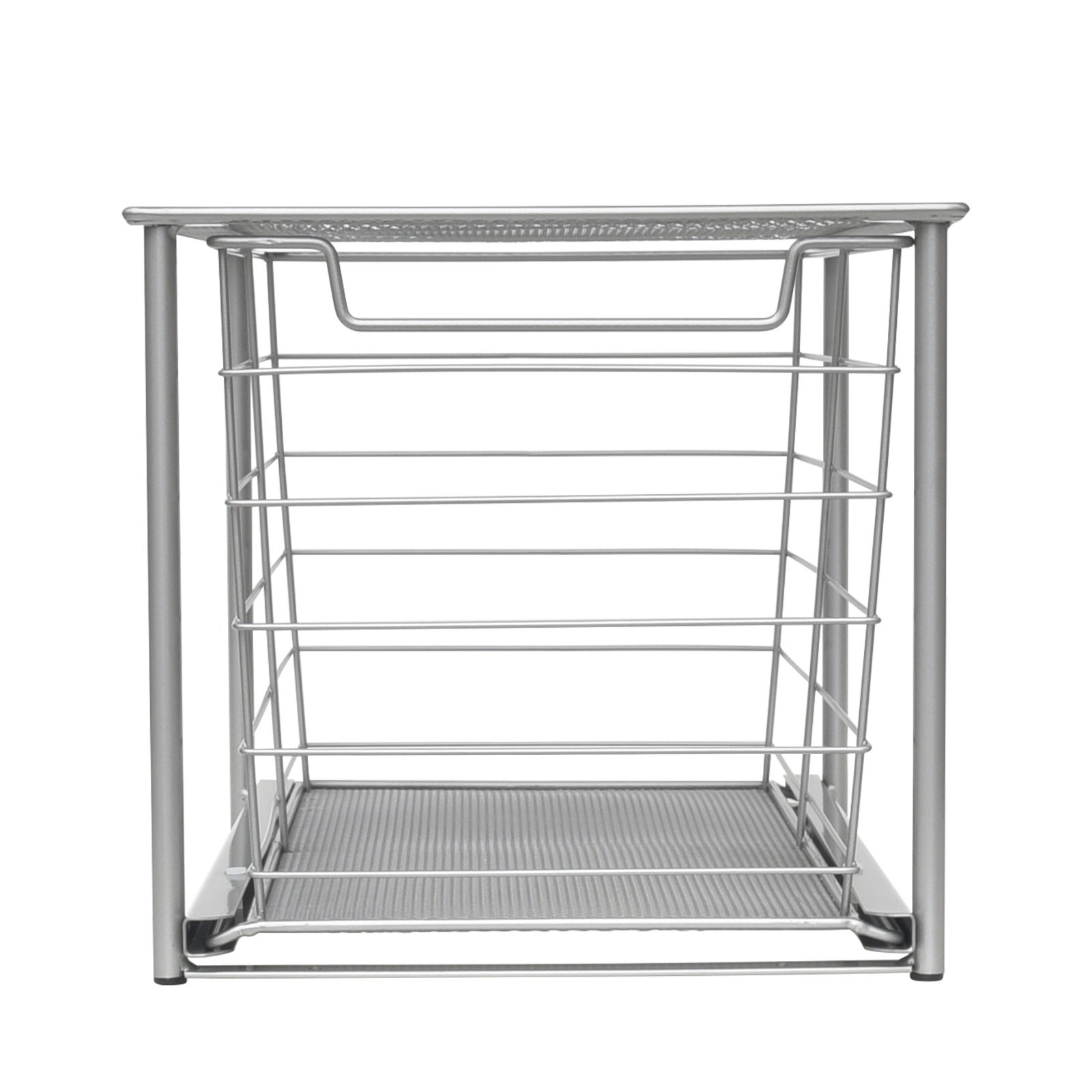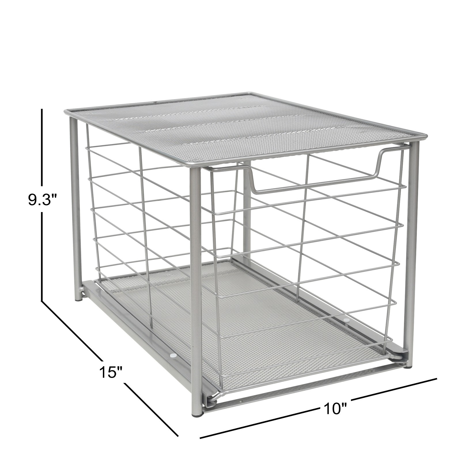 Product details Keep your bathroom organized with the Mainstays Large Stackable Slide-Out Drawer Organizer. This storage drawer is a perfect solution to keep your hair tools tidied and store extra bath and beauty essentials. The attractive design makes it perfect for use on countertops, shelves, closets or under sinks. The stackable design allows for vertical storage, maximizing your storage space. Pair it with the Mainstays Small Stackable Slide Out Storage Drawer for a custom storage solution. It even includes hardware for under cabinet mounting if you desire! Keep your bathroom essentials tidy with the Mainstays Large Stackable Slide-Out Drawer Organizer. Getting organized is often a matter of finding the right equipment to store your stuff. Mainstays organization and storage products are suitable for use throughout your home. Some of the products in this section are designed for use in a specific area, such as your closets or kitchen, and you can focus on these specific products if you know what you need. If you don't yet know what organization and storage products might solve your problems, scroll through the product listings in this section to get inspiration. Product descriptions and names are helpful guides to consider as you browse. Mainstays Large Stackable Slide-Out Drawer Organizer, Satin Nickel, 15" x 10 " X 9.3" Perfectly sized to organize hair tools and extra bathroom essentials Sliding basket for ease of access Satin Nickel finish fits into any decor Stackable design allows for a vertical storage solution Compatible with the Mainstays Small Stackable Slide-Out Drawer Durable, rust resistant steel construction and padded feet Drawer can be fastened under cabinet with included hardware