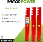 Includes 3 commercial mulching blades for many 60 in. cut Exmark and Windsor mowers Replaces Exmark OEM #'s 103-6393, 103-6398, 103-6398-S, 116-5174, 116-5174-S and Windsor OEM #51-2810 Each blade measures 20 in. L and 2.5 in. W 15/16 in. center hole diameter