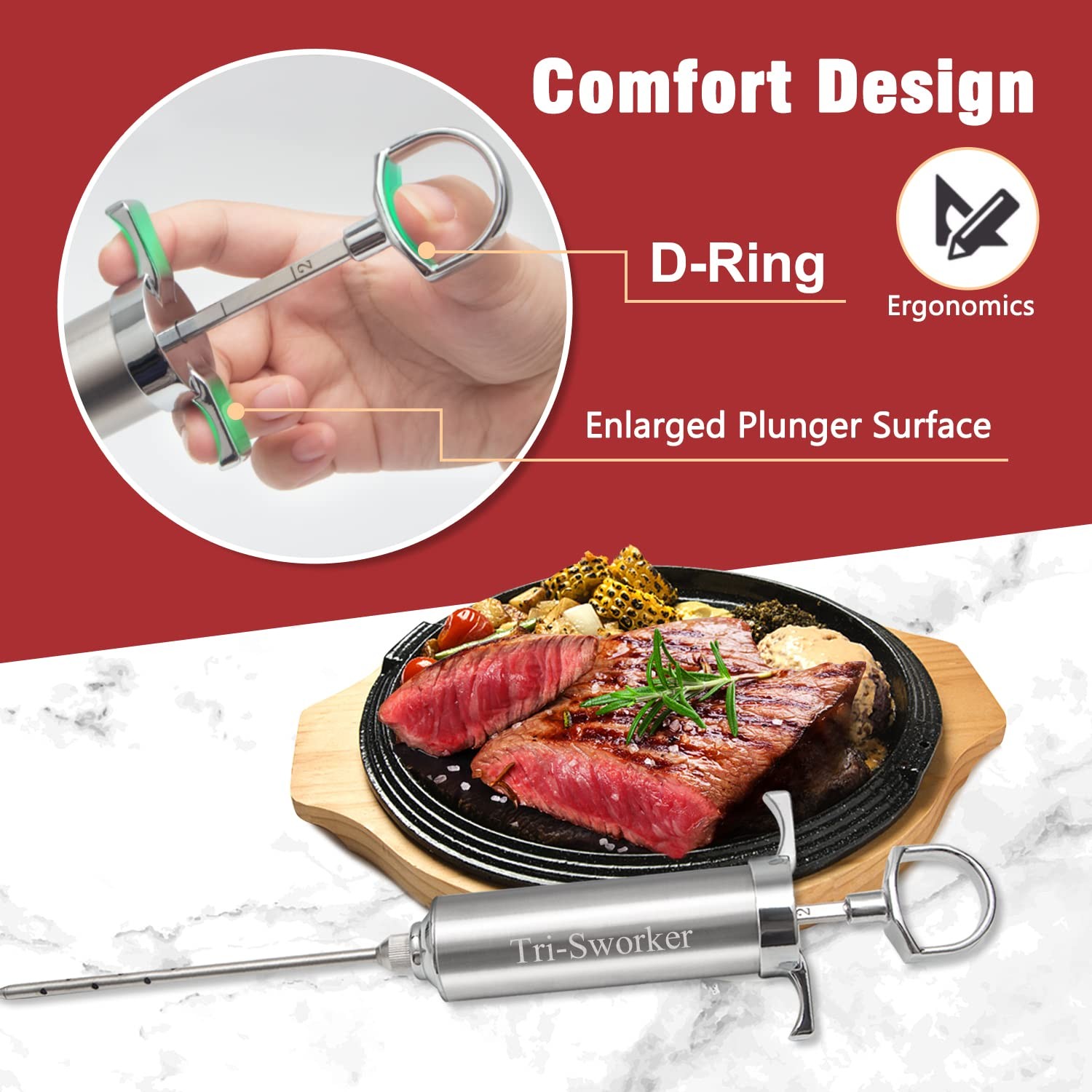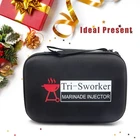 Marinade Meat Injector Kit’s Composition Food-Safe culinary stainless steel , absolutely security to touch food, anti-rust. Solution Turkey Injector needle’s Clogging Issue The biggest needle which specially designed to solve the blockage problem of large garlic granules and onion particles when injecting marinade into large pieces of meat, you won’t worry clogging up again. X-large Plunger Surface Makes Your Finger More Comfortable Different old-style 3 narrow O-rings plunger flavor injector, our new-style food injector greatly increases the force surface, which makes your finger still comfortable even if you meet some thick meat hard to injecting. 4 Types Meat Needles with Different Size and Functions to Choose 6"(Over-sized) angled cut needle for injecting marinades including large garlic granules, onion particles and other big mixed solids seasoning. 6"(Standard-sized ) angled cut needle for injecting marinades including little mixed solids seasoning, and any liquid sauce with no solid. 6" Multi-12-holes sharp needle for injecting smaller mixed particles solids seasoning, and any liquid sauce marinades or brine. 3" small hole sharp needle for injecting any liquid sauce marinades or brine, mainly applied to small cuts of meat. Brisket injector syringe kit set has a comprehensive configuration, especially the travel case and meat smoking guide, very useful for BBQ, to BBQ fanatics you want to give when Mother & Father’s day, BBQ Season, Thanksgiving & Christmas day comes We believe in our food injector, so we can provide Unconditional Return Policy; Our timely and friendly customer service team always stand behind our products. WARNING: Marinade Needles Are Pretty Sharp! KEEP OUT OF THE REACH OF CHILDREN! Safe &Sturdy--meat injector barrel and needles are made of stainless steel, absolutely security to touch food, keep your family safe and healthy; stainless steel texture for meat marinade injector, anti-rust Never Clogging Needle--food injector with 4 needles for different functions, especially the biggest needle, which specially designed to solve the blockage problem of large garlic granules and onion particles for injecting marinade into Turkey, Meat, Brisket, Brine and Chicken Enhanced Plunger Design--compare to old-style 3 narrow O-rings plunger turkey injector, our new-style flavor injector greatly increases the force surface, which makes your finger still comfortable even if you meet some thick meat hard to injecting Widely Various Application--use for Thanksgiving and Christmas turkey, beef brisket or daily BBQ party; for relatives or friends who like to grill when Mother's Day, Father's Day, Thanksgiving and Christmas come around What You Will Get--1 travel case; 1 meat syringe; 4 meat needles; 4 cleaning bushes; 6 syringe silicone O-rings