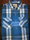 Men's Hollister long sleeve snap front Western shirt: Size Medium All cotton Blue and white plaid Two snap-down pockets Pearlized snap covers Logo on the pocket Measures approximately 22x28 Great shirt from a smoke-free home!