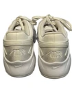 These are pre-owned Nike Air Max Bolt Triple White. They feature a mesh and leather upper with a white rubber sole. The shoes have a lace-up closure and a padded tongue and collar. The Nike swoosh logo is visible on the side of the shoes. The shoes are in good condition with some minor signs of wear. The soles are slightly worn and there are some minor scuffs on the upper. The shoes are size 7.5. SERIES Air Max NICKNAME Triple White STYLE Sports SEASON All Season UPPER MATERIAL Fabric/Synthetic Leather CLOSURE Lacing SOLE MATERIAL Rubber Sole TOE TYPE Round Toe HEEL TYPE Thick bottom COLOR WAY White