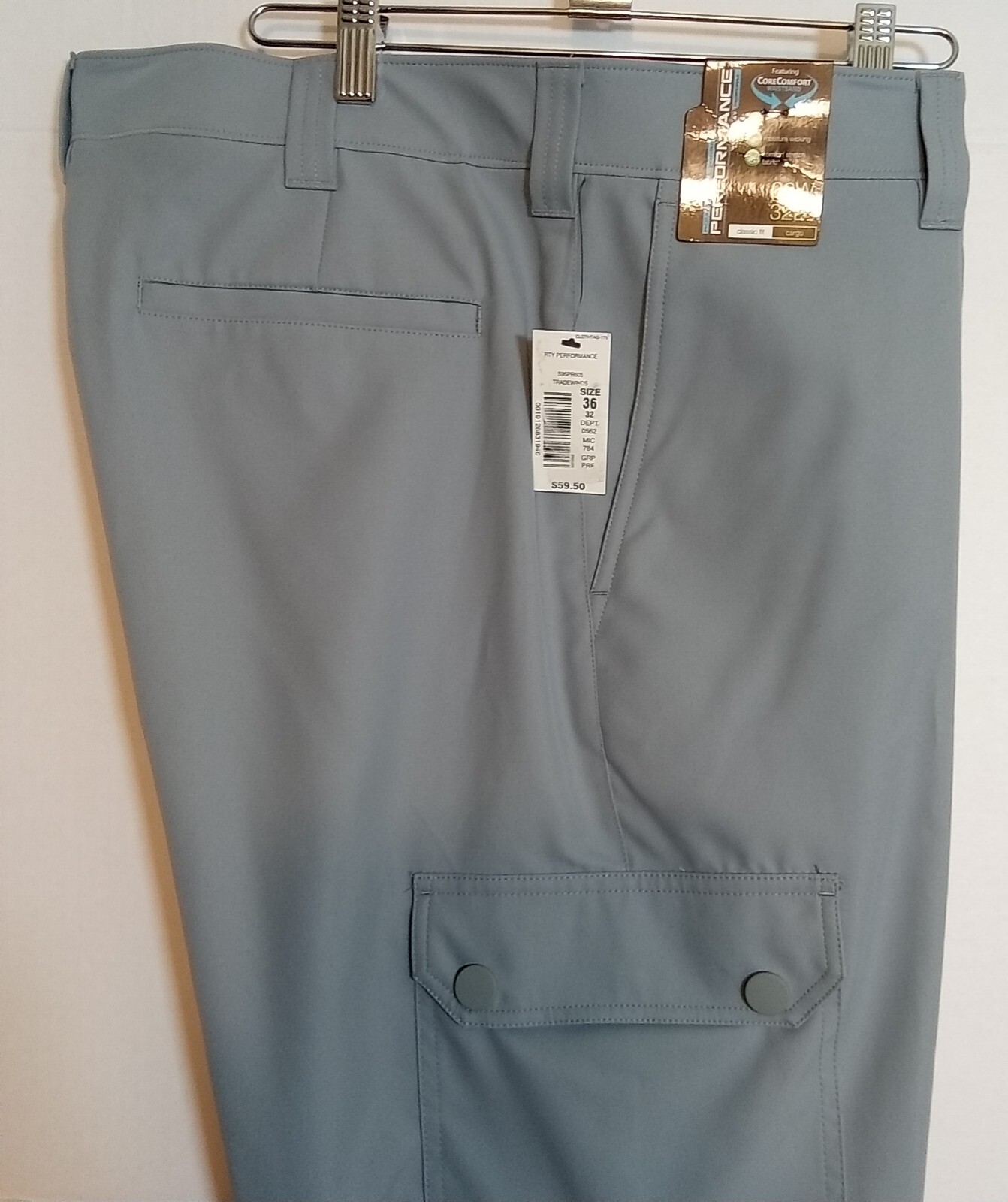 NWT. Elevate your work wardrobe with these versatile cargo performance pants from Rountree & Yorke. Crafted from moisture-wicking polyester material, these pants come in a classic fit with a straight leg style and flat front design. The gray color and solid pattern make them a timeless addition to any outfit, while the snap button and zipper accents add a touch of style. The pants feature cargo and slash pockets, making them practical for carrying essentials. They are machine washable, making them easy to care for. These pants are perfect for summer, fall, and spring seasons and are available in size 36 waist and 32 inseam. Add these pants to your collection for a comfortable and stylish option for work or casual outings. MSRP $59.50 G10 BOX - 1392
