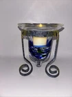 This is a clear, blue. and green glass candleholder in a 3 legged metal base. Candle not included H