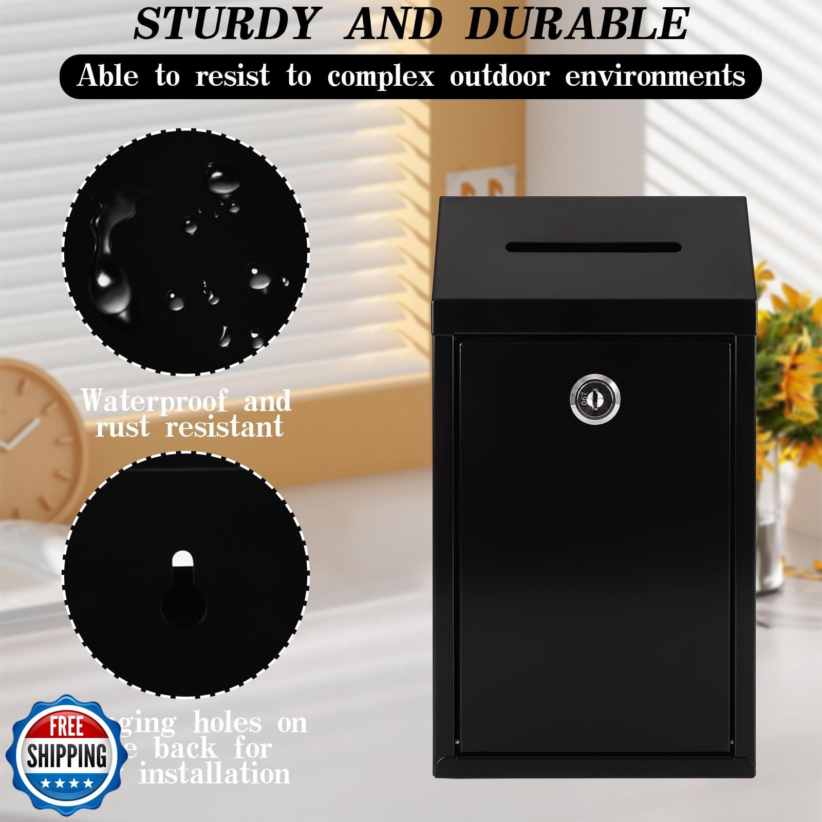 Metal Donation Box with Lock Ballot Box Drop Box with Lock Suggestion Box with Slot and Lock Metal Lock Box Comment Box Voting Box Key Drop Box for Home Office(Black,10.24 x 5.71 x 2.95 Inch) Features Perfect Size: Includes one Metal Donation Box with two keys, measuring 10.24 x 5.71 x 2.95 inches (26 x 14.5 x 7.5 cm). Its compact size saves space while providing convenience for your home. Premium Material: Made of high quality metal, this outdoor lockable mailbox is sturdy, weather resistant, rustproof, and deformation-free, ensuring long-lasting performance for secure mail storage. Easy Installation: Pre drilled holes on the back allow for hassle free mounting. Simply use nails or hooks to hang it on walls, doors, fences, or other surfaces for quick setup and easy use. Thoughtful Design: Key drop box features a rainproof top cover to keep water out, a small slot for easy mail delivery, and a front keyhole for secure and convenient access to stored items. Versatile Use: Designed with a compact size and pre drilled holes, this drop box with lock is perfect for hanging on walls, doors, or fences, offering flexible placement options to suit your daily needs. Shipping Free & Fast Shipping: We offer free shipping to most of the USA with a normal delivery time of 3-7 days. However, due to the current situation, additional delivery time (up to 3 weeks) may be required for some items. Alternative Carriers: We may use alternative carriers (e.g., USPS, FedEx, UPS) to ensure your package arrives safely and on time. Due to the use of multiple carriers, we are unable to provide a tracking number automatically. Handling Time: Orders are processed and shipped within 1-2 business days of receiving cleared payment. Shipping Restrictions: Shipping to Alaska, Hawaii, Puerto Rico, Guam, and other US territories may incur shipping charges or delivery restrictions. Please contact us before ordering, or your order can be refunded/cancelled. State Restrictions: Certain items may not be shipped to California due to state regulations. Contact for Tracking Updates: If you require tracking updates or have any concerns about the delivery of your order, please feel free to contact us, and we will be happy to assist you. Return Policy 30-Day Hassle-Free Returns: If you are not completely satisfied with your purchase, you can return the item for free within 30 days of receiving it for a full refund or exchange. Easy Return Process: Contact us, and we will provide you with a prepaid return shipping label and detailed instructions. No Restocking Fee: There are no restocking fees for returns. However, the buyer is responsible for return shipping costs if the return is not due to a seller"s error. Refund Processing: Refunds will be processed within 1 business day of receiving the returned item in its original condition. Feedback Your feedback is extremely important to us. We strive to provide the best products and customer service possible. If you are satisfied with your purchase, please take a moment to leave us a positive review. If you have any concerns or issues with your order, please contact us before leaving negative feedback. We are committed to resolving any problems and ensuring your satisfaction. Contact Us If you have any questions or concerns, please feel free to reach out to our customer support team. You can contact us through the eBay messaging system. We are available Monday to Friday, 9:00 am to 5:00 pm EST, and we will do our best to respond to your inquiry within 24 hours. Thank you for supporting our small family business!