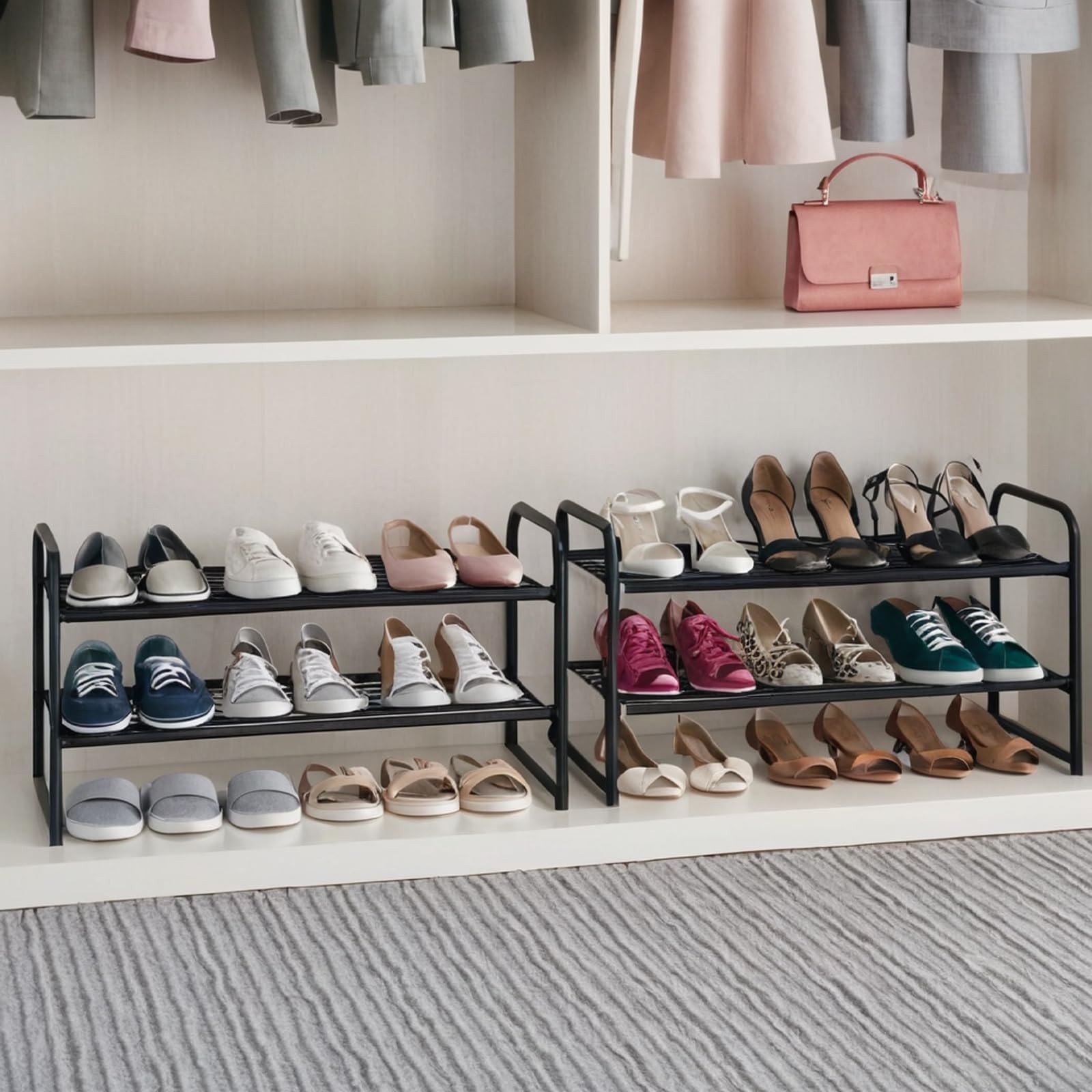 Our Wall Shoe Rack uses an innovative push-fit design with fully removable shelves, allowing you to easily store both everyday shoes & sneakers, together with large & tall boots, or separated into the different DIY shoe racks. Keep all your shoes neat and organized. With a fully open, vertical design allowing you to easily and quickly find the perfect shoes you need. Designed with 30% thicker push-fit metal tubes & plastic connectors, our Shoe Shelf can be easily assembled in minutes without complicated tools. With a load capacity of up to 50 pounds per tier, it won't wobble or topple, even when fully loaded with 50 pairs of large shoes. Comes with user manual to help you assemble the shoe rack quickly and easily. Save space & get organized with our premium quality 2 column 7 Tier Shoe Rack with removable tiers, super easy to clean, water-resistant fabric shelves, and really strong, wobble tubular design capable of organizing up to 50 pairs of shoes, high heels, boots & small accessories. If the product has any problem, we promise that we will help you solve it ASAP. 【Versatile】Our Wall Shoes Rack uses an innovative push-fit design with fully removable shelves, allowing you to easily store both everyday shoes & sneakers, together with large & tall boots, or separated into the different DIY shoe racks. Keep all your shoes neat and organized. With a fully open, vertical design allowing you to easily and quickly find the perfect shoes you need 【Large Storage Shoe Rack】Save space & get organized with our premium quality 2 column 2 Tier Shoes Rack with removable tiers, super easy to clean, water-resistant fabric shelves, and really strong, wobble tubular design capable of organizing up to 8 pairs of shoes, high heels, boots & small accessories 【Convenient & Space Saving】Our this shoes rack with 10 versatile hooks, you can hang a lot of things on it. The PP plastic sheet of the shoe rack's top is waterproof and easy to clean. Measuring 26.6"H x 14.2"W x 11.2"D, our Tall Shoe Rack is perfectly sized for storage behind doors, in bedrooms, or in larger entryways & closets 【Durable】Unlike other shoes organizers, our Vertical Shoe Rack uses 100% non-woven fabric tiered shelves with durable water, dust & oil-resistant coating allowing for easy cleaning of residual debris, dirt & rain when storing outdoor shoes after a busy day. Save your time and make your life more efficient and comfortable 【Super Easy to Assemble】Designed with 30% thicker push-fit metal tubes & plastic connectors, our Shoes Shelf can be easily assembled in minutes without complicated tools. With a load capacity of up to 50 pounds per tier, it won't wobble or topple, even when fully loaded with 8 pairs of large shoes. Comes with user manual to help you assemble the shoe rack quickly and easily