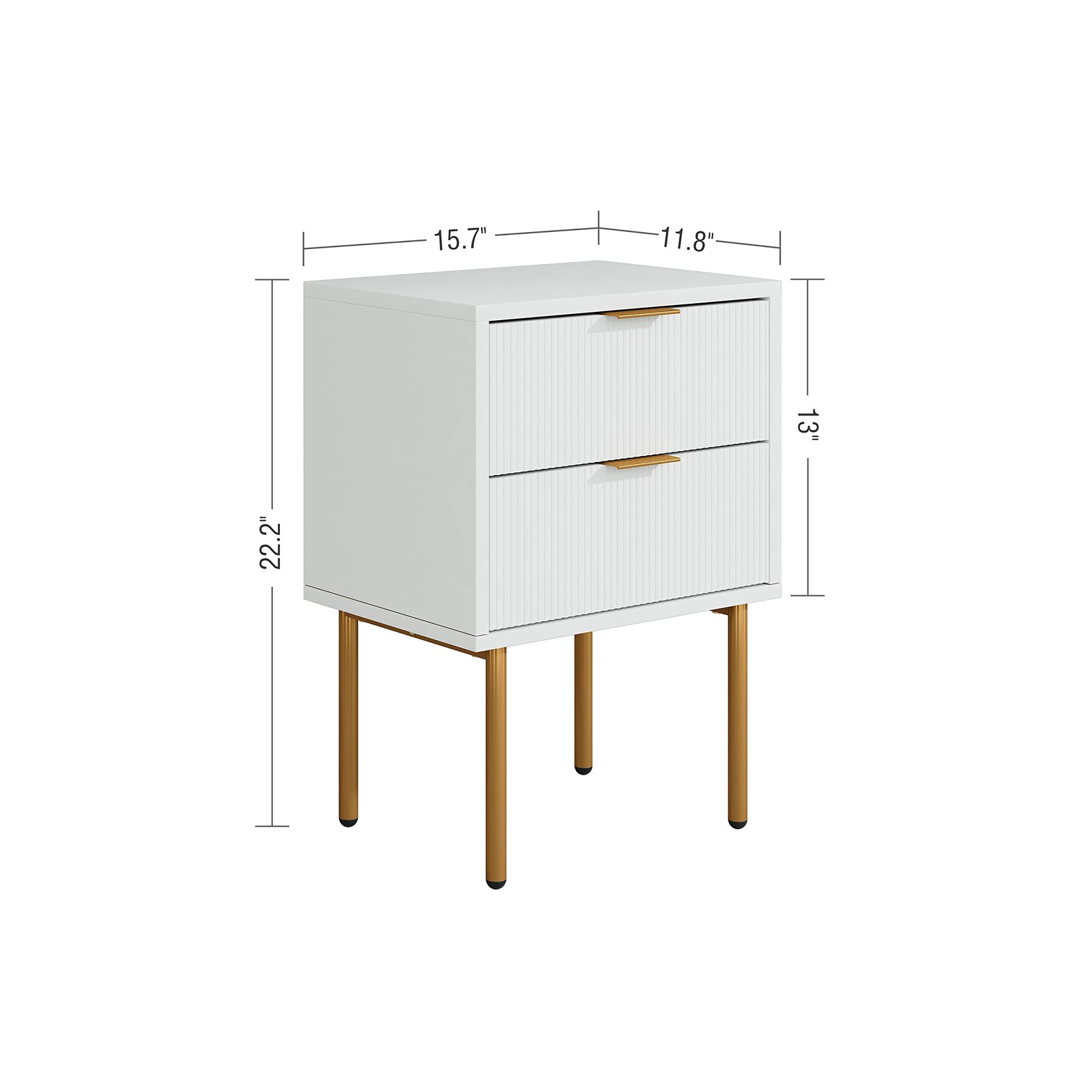 Dresser for Bedroom, Fluted Night Stand, End Table for Living Room, Mid Century Modern Bedside Table with Drawers, Nightstand with Gold Metal Legs, Bedroom Furniture Fluted Modern Design: This modern bedside table features a stylish fluted pattern, adding a modern and visually appealing touch to your bedroom decor. It can also catch eyes as a side table or end table throughout the home,adding elegance to home life. The nightstand measures 15.35""L x 11.42""W x 22.44""H. Spacious Storage Space: The mid century modern nightstand with striped design offers convenient storage options with its spacious drawers. The bedside table comes with drawers to tuck away books, diaries, glasses, medicines, or private essentials. The wide top is perfect for displaying a lamp, clock, potted plant or photo frame to offer warmth and personalized decoration. Multiple uses applications: It can not only help you tidy your room, but also serve as a decoration to make your home more attractive. Our bedside table is not only suitable for the bedroom, but also for the living room or balcony as a coffee table. Imagine sitting next to the simple cabinet on a relaxing afternoon or evening, enjoying a cup of coffee. How a nice day! Sturdy and Durable: High quality MDF wood, sleek lacquer and modern metal give you triple the texture. The nightstand is wear resistant and waterproof, so it's extra durable. There is an anti dumping device on the back of the chest to ensure the safety of kids or pets. The smooth metal guide rail allows the drawer to be pulled out and closed easily and silently. Easy to Assemble: The Drawer Dresser for Bedroom comes with detailed instructions and all necessary parts in the package. You can easily install this Nightstand, and quickly clean and use. Please feel free to contact us if you have any questions on Nightstand. We will respond quickly within 24 hours. Fluted Modern Design: This modern white bedside table features a stylish fluted pattern, adding a modern and visually appealing touch to your bedroom decor. It can also catch eyes as a side table or end table throughout the home,adding elegance to home life. The nightstand measures 15.35""L x 11.42""W x 22.44""H. Spacious Storage Space: The mid century modern nightstand with striped design offers convenient storage options with its spacious drawers. The bedside table comes with drawers to tuck away books, diaries, glasses, medicines, or private essentials. The wide top is perfect for displaying a lamp, clock, potted plant or photo frame to offer warmth and personalized decoration. Multiple uses applications: It can not only help you tidy your room, but also serve as a decoration to make your home more attractive. Our bedside table is not only suitable for the bedroom, but also for the living room or balcony as a coffee table. Imagine sitting next to the simple cabinet on a relaxing afternoon or evening, enjoying a cup of coffee. How a nice day! Sturdy and Durable: High quality MDF wood, sleek lacquer and modern metal give you triple the texture. The nightstand is wear resistant and waterproof, so it's extra durable. There is an anti dumping device on the back of the chest to ensure the safety of kids or pets. The smooth metal guide rail allows the drawer to be pulled out and closed easily and silently. Easy to Assemble: The Drawer Dresser for Bedroom comes with detailed instructions and all necessary parts in the package. You can easily install this Nightstand, and quickly clean and use. Please feel free to contact us if you have any questions on Nightstand. We will respond quickly within 24 hours.