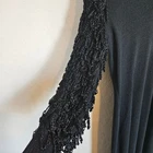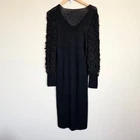 Milton Ford For Patricele LTD Black Long Sleeve Knit Dress Vintage Whimsygoth V neckline Long sleeves with 3D chain link crochet loop fringe Knitted dress The size tag and material tag are gone. Vintage 1960s or 1970s Reminds of something Morticia Addams would wear. Size Small - Medium Approximate Measurements: pit to pit - 18" across waist - 14" hips - 17" length - 45.5" Excellent pre-owned vintage condition, no rips, tears or stains. The shoulder seam was coming apart, I did sew it. Please see pictures. Smoke free, dog friendly home. whimsygoth gothic vintage artsy maximalism fantasy fashion twee quirky emo punk scene goth Victorian baddie Morticia Addams Wednesday edgy alternative neutral fall autumn winter