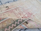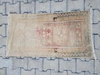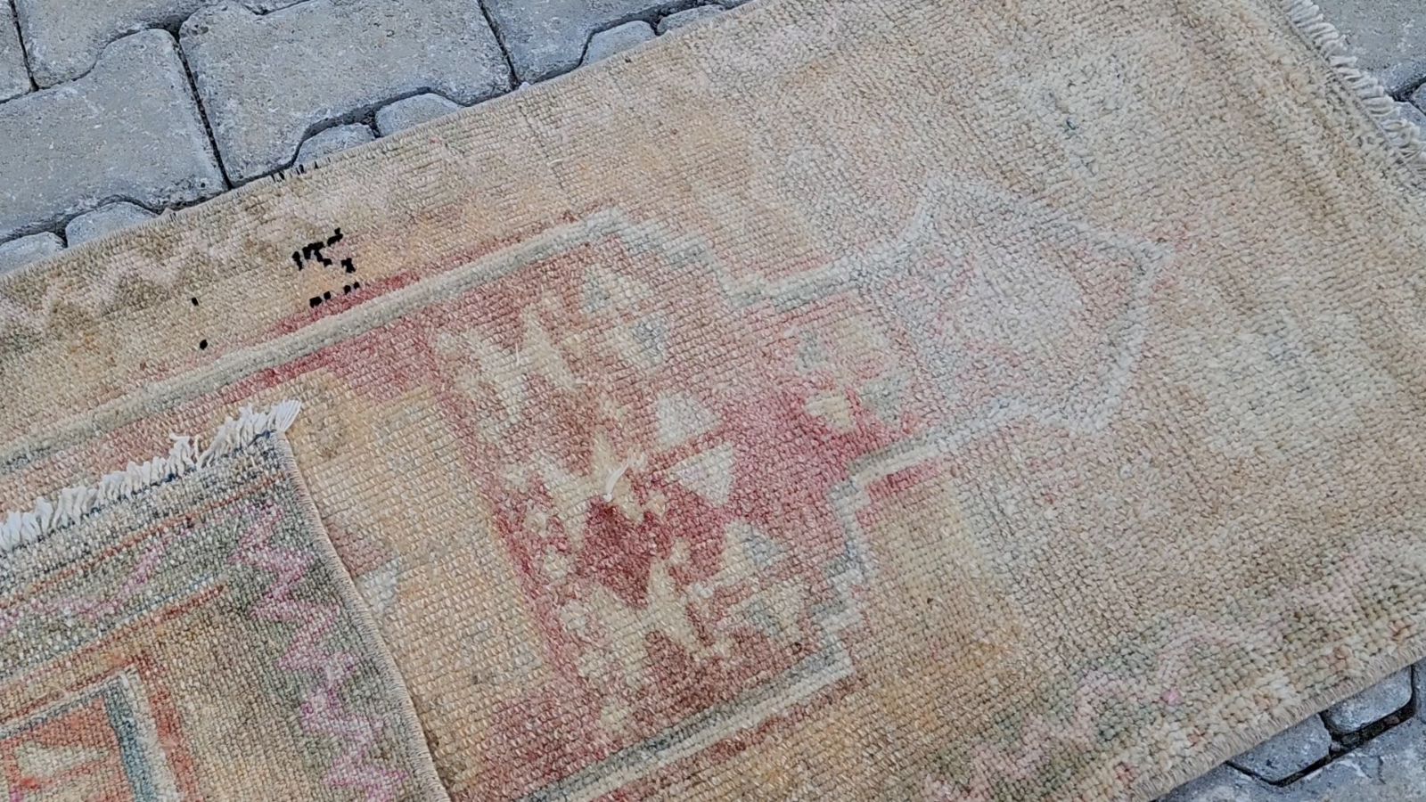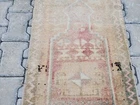 Mini Turkish Oushak Rug β 1.8x3.4 ft, Faded Pink & Beige, Prayer Rug Style Handwoven Vintage Wool Rug β Subtle Colors with Washed Seccade Pattern This beautiful handwoven Turkish rug features a classic prayer rug (seccade) design, with a soft triangle mihrab at the top and star motifs throughout the center. The faded rose pink center is gently framed by pastel green and pink zigzag borders, creating a delicate and calm aesthetic. Crafted from 100% natural wool and dyed with traditional plant-based pigments, this rug has a naturally aged patina with a washed, vintage finish. Its narrow size makes it ideal for hallways, bedside, or bohemian corners. Product Details: π Origin: Turkey π Material: 100% natural wool, vegetable-dyed π Weaving: Handwoven, vintage style π Pattern: Prayer rug layout with star and floral motifs π Colors: Beige, faded rose, pastel green, soft pink π Condition: Vintage β gently distressed and naturally aged π Size: 56 x 104 cm (1.8 x 3.4 ft) π Shipping: Free worldwide shipping in 1β3 business days π Returns: 30-day return policy π¬ Feel free to message us with any questions!