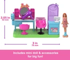 Enter Mini BarbieLand with Barbie collectible playsets and arrive ready to imagine big and Dream in Mini! The Hair Salon playset is ready for play or display and comes with a 1.5-inch mini doll! Playset features fun, interactive play areas like a style station with mirror, shampoo area and reception desk. Kids can play out the storytelling fun again and again with the 1.5-inch doll in different play areas including the salon chairs that tilt back and the product display that flips! Doll bends at the waist to sit and features an attached heart-shaped base that is versatile and works with other Barbie houses, vehicles and playsets. Fans can collect all the Mini BarbieLand dolls and playsets to design their own mini worlds and build big possibilities (each sold separately, subject to availability)! Enter the world of Barbie doll with Mini BarbieLand -- a place to imagine big and Dream in Mini! Built with tiny cuteness and big surprise, this mini Hair Salon playset is ready for play or display. This playset features interactive play areas like a style station with mirror, shampoo area, reception desk and a mini 1.5-inch Barbie doll! The mini doll bends at the waist and stands on a heart-shaped base that works with other Barbie houses, vehicles and playsets. Fans ages 4 years and older will want to collect all the Mini BarbieLand doll, vehicles and playsets to build their own mini world! Each sold separately, subject to availability. Colors and decorations may vary.