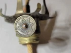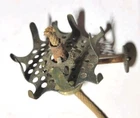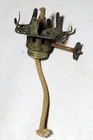Antique 19th Century European Miniature Oil Lamp Burner with Shade Holder. The center holds a chimney with a 1-1/8" fitter. The outer prongs appear to hold a shade with a 1-1/2" fitter. The threaded bottom is 5/8" diameter. Good condition with normal signs of age and use such as dents in the metal. Untested for use.