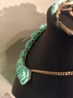 This mint green carved flower bib necklace is the perfect accessory for any occasion. The necklace is made of resin and gold tone metal cable chain, with a lobster closure and extender. The 7 flower pendants have exquisite detail and the necklace is nickel-free and stackable. The necklace is 16 inches in length, with an 2"extender for adjustable comfort. The necklace comes with matching hoop earrings for a complete look. One of the earrings is missing a flower at the bottom. Please see photos for exact condition. All offers considered and I will combine shipping on multiple orders. Thanks for looking!