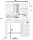 Product Description About this item Stylish and Delicate: This white makeup vanity will comply with your other furniture, adding modern style to your room. Plus its stylish and functional, it is an ideal choice for your bedroom or dressing room Plenty of Storage Function: The vanity table with 5 drawers and 2 open storage shelves, providing ample storage space for your cosmetics, jewellery and hair accessories etc. And the wide tabletop also offers enough room to put some daily-used beauty essentials for easy access Lighting Modes & Adjustable Brightness: Comes with a mirror and 10 LED bulbs for the vanity desk. The brightness of the lights is adjustable with 3 colors to choose from: warm yellow, warm white and cool white, so that you can choose different light colors for different scenes and different make-up Makeup Table with Charging Station: This makeup vanity has a built-in charging station on the right tabletop, including 2 AC outlets and 2 USB ports, it is very easy for you to charge your electronics in time Stable and Easy Assembly: Made of EPA-grade particleboard, which makes the dressing table stable. Equipped with detailed instructions, all parts and accessories are labeled, you can put the vanity together more easily and faster Modern Vanity Table with charging station and side shelf This vanity table features the lighted mirror and charging station, which offers impressive lighting performance and makes it convenient to charge electronic device, a ideal surprise for your family and beloved! Note: The bench is not include Specification: Color: White Material: EPA-grade Particleboard Product Size: 35.4"L x 15.7"W x 53.9"H (90 x 40 x 137 cm) N. W.: 69 lb G. W.: 80 lb Package Contents: 1 x Vanity Table with Charging Station 1 x Instructions 1 x Tools Bag Damaged or missing parts? We can send you new parts or boards, Please keep pictures of damaged products and boxes (including logistics tracking numbers) I can't find the manual We can send you an electronic version of the manual More Product