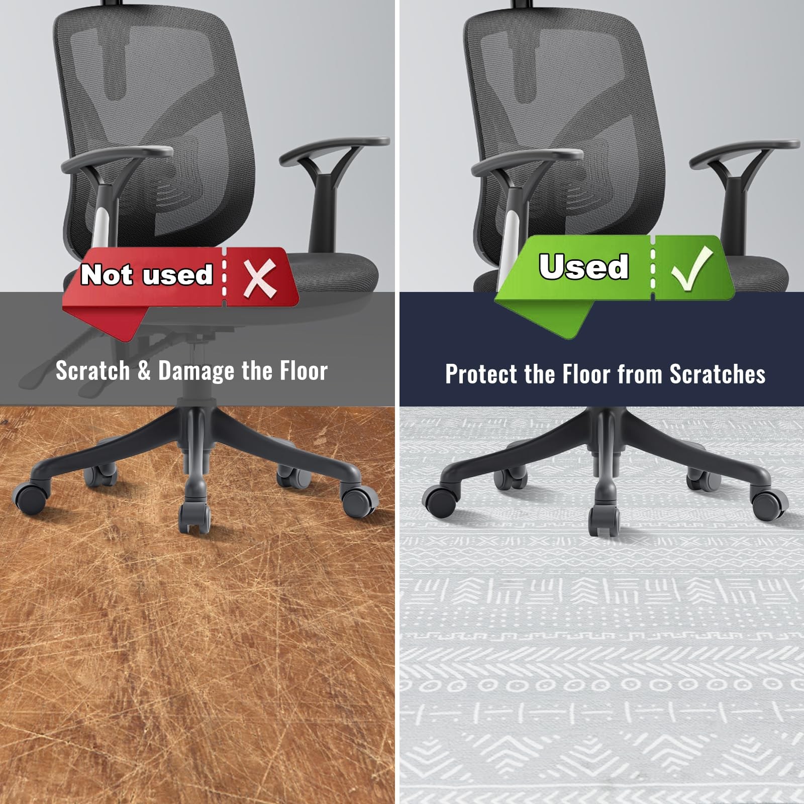 Geometric Style of Office Chair Mat - Tired of the plain plastic chair mat on the floor? Our desk chair mat with geometric design can solve your problem. The pattern of the chair mat for hardwood floor has combined different kinds of dots and lines to create varied patterns which are not very complicated meanwhile elegant. The floor mat for office chair can add a sense of harmony to your home and working area. Geometric Style of Office Chair Mat - Tired of the plain plastic chair mat on the floor? Our desk chair mat with geometric design can solve your problem. The pattern of the chair mat for hardwood floor has combined different kinds of dots and lines to create varied patterns which are not very complicated meanwhile elegant. The floor mat for office chair can add a sense of harmony to your home and working area. Bottom of Chair Mats without Slipping - The back of office chair mat for hardwood floor is made of anti-slip materials that have a firm grip on the floor. Therefore the computer chair mat will not moving around even under the influence of external forces like chair moving and walking. The desk mat for chair will stay still on the ground and you don’t need to worry about slipping anymore. Suitable Size & Thickness - The size of the geometric desk floor mat is 48" x 36" and the thickness is 0.15". Large enough to allow the office chair to roll freely on our desk chair mat for hardwood, at the same time preventing the floor from potential scratches. The low-pile office mat with this thickness also hardly sheds and can be used for a long time. Office Floor Mat Easy to Clean - Made of soft and durable materials, the office chair mats can be cleaned easily by washing machine and vacuum without wrinkles and damage. The low pile feature also enables the dirt on the rolling chair mat for hardwood to be swept and wiped out without effort, relieving your stress in daily desk floor mat for hardwood floors cleaning and maintaining. Wide Applications of Rolling Chair Mat - Our desk chair mat for hardwood floor is suitable in many occasions and settings, not only in the office but also in the family space. The under desk mat can be applied in the office, the living room, the kitchen and the bedroom. You can either roll your chair mat or dine on the kitchen table with the office rug underneath. Feel free to place the office chair mat as you wish.