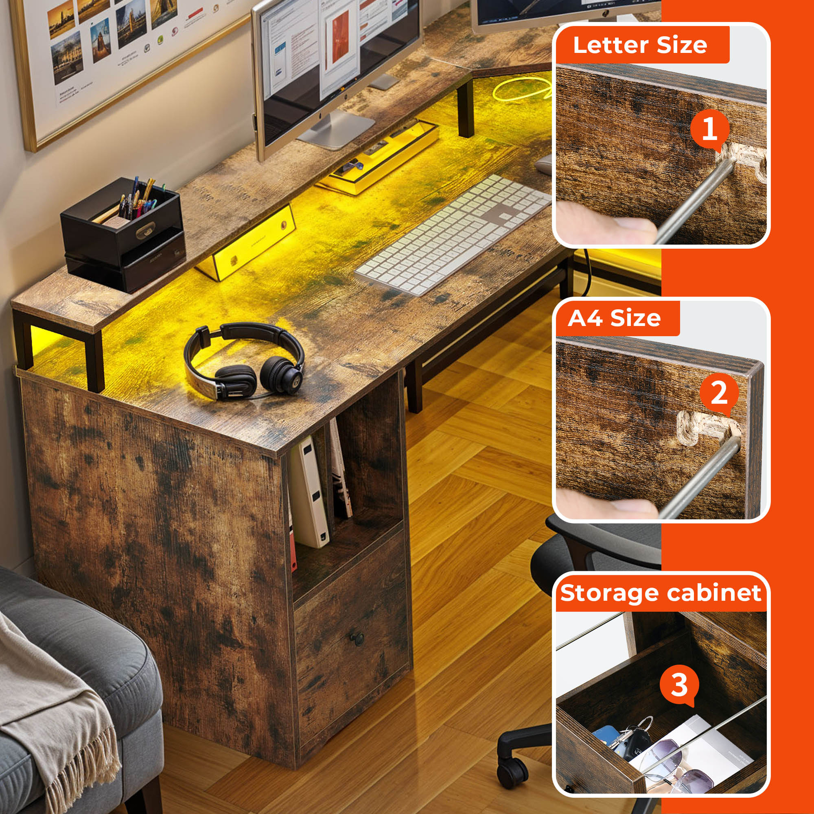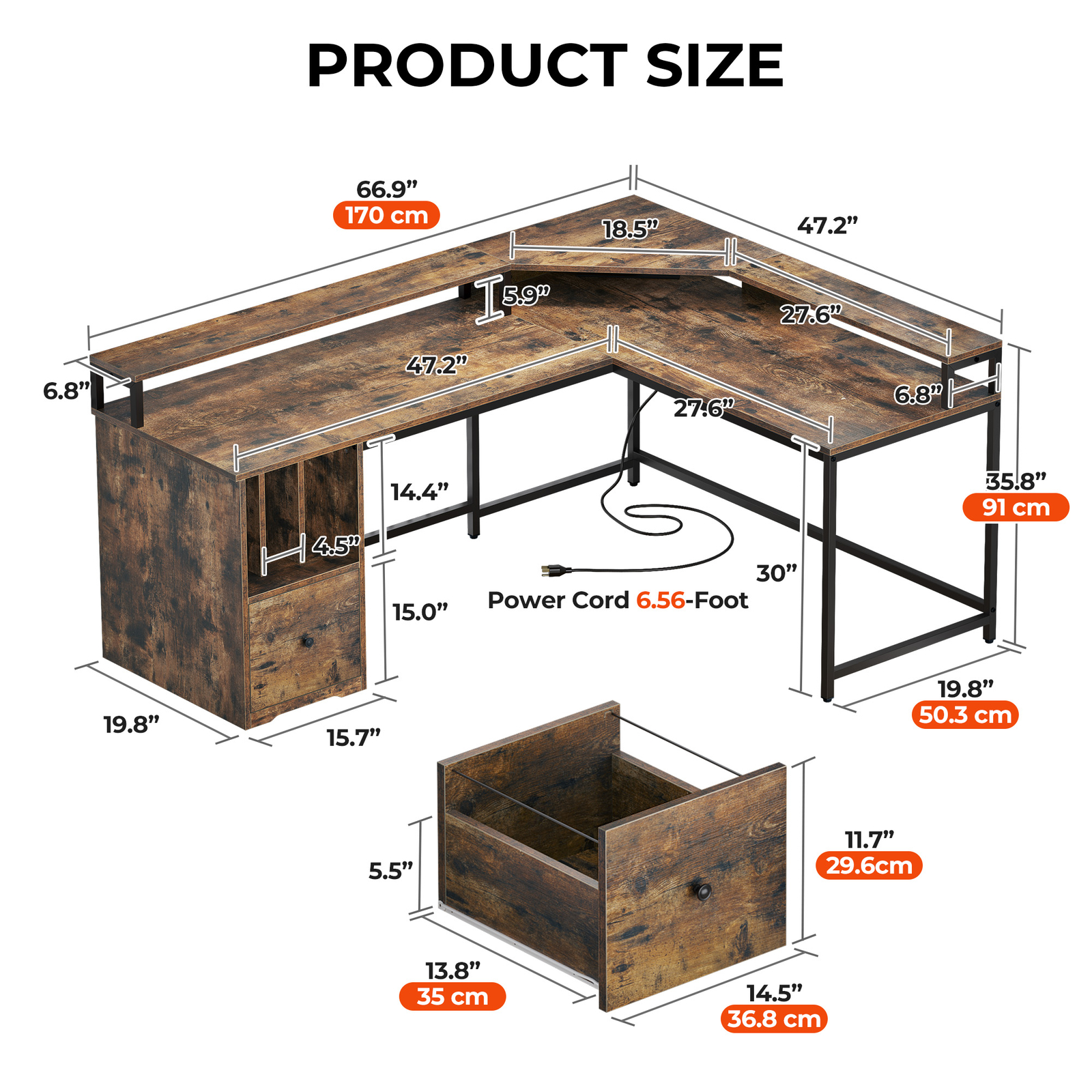 Product Description NOTE: Professional Installation would be Highly Recommended. Specifications: 1. Material: Particle Board, Iron, Metal Handle 2. Shape: L-Shaped 3. Color: Rustic Brown 4. Desk Dimensions Overall: 66.9"L x 47.2"W x 35.8"H 5. File Drawer Dimensions: 14.5"L X 13.8"W X 11.7"H 8. Item Weight: 97.22 lbs 9. Storage Options: 3 Open Shelves, 1 File Drawer 10. Mounting Type: Free Standing 11. Cable Management: 4 AC Power Outlets (120V/12A), 2 USB Ports (5V/2A), Power Cord (6.56 feet) 12. Special Features: Monitor Stand, Adjustable Leg Pads, App controlled Adjustable LED Lights 13. Room Category: Office, Study Room, Gaming Room, Library, Living Room Package Included: 1. 1 x L-Shaped Desk 2. 1 x Packet of Fittings 3. 1 x Instructions Manual Product Details Maximum Efficiency : Our desk provides versatile storage options for computers, laptops, decor, books, files, and more. The elevated monitor stand offers ample space for multiple monitors, promoting maximum efficiency and organization while reducing neck strain during extended sessions. Customizable LED Lighting : Enhance your ambiance with dynamic lighting that adjusts to your mood and preferences, easily controlled via a phone app. Whether creating a productive work environment or setting a gaming vibe, anything is possible. Sync your lights to favorite tunes for an amazing experience. Charging Hub: Stay connected and productive with our desk's built-in charging station, featuring 2 USB ports and 4 power outlets. Effortlessly charge devices while maintaining a clutter-free workspace, thanks to the 6.56-foot power cord and integrated cable management system. Sleek Design : Effortlessly manage documents with the multifunctional file drawer, expertly designed to accommodate various document sizes. Optimize storage space with three tall, narrow open shelves for vertical storage of books, magazines, and more. Enjoy smooth access to belongings with the drawer's sleek metal glides and handle, while adjusting the desk's height to your preference with convenient adjustable feet pads. Shipping 1. The shipping rates listed are only for residential or commercial destinations in the continental 48 states of USA. All international sales will go through eBay International Shipping Program. 2. We don't ship to Hawaii, Alaska, Puerto Rico, APO/FPO/PO Boxes. 3. Please verify the correct shipping address in your PayPal account before making the payment. We only dispatch the item to the address that is sent to us at the time of checkout. 4. The major delivery we use are USPS, UPS, FedEx & LTL. 5. Normally the item will be dipatched within 1 business day if payment is cleared before 12pm PST. 6. We don't provide local pick-up service. Payment 1. We accept PayPal and credit card. 2. Ship to the confirmed Paypal shipping address that is provided with the payment. Return 1. 30 days Money Back Guarantee. 2. Please contact our customer service to receive a RMA form first if want to return the item. 3. All returned items MUST in new condition with the original package. On Sep 2, 2024 at 05:09:46 PDT, seller added the following information: On Sep 24, 2024 at 22:20:58 PDT, seller added the following information: On Nov 3, 2024 at 20:52:11 PST, seller added the following information: On Nov 10, 2024 at 21:40:35 PST, seller added the following information: On Dec 4, 2024 at 03:02:26 PST, seller added the following information: On Feb 20, 2025 at 06:09:25 PST, seller added the following information: