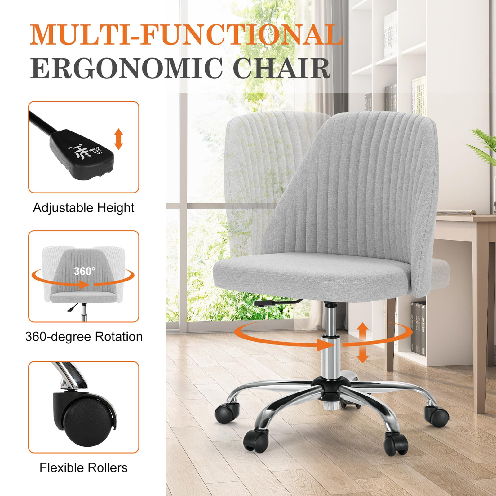 This armless office chair is made of high quality fabric and features a unique durable foam padding seat cushion that is highly durable and resistant to deformation, providing the necessary comfort and support for long hours of use; its curved backrest is designed to provide excellent support for the back, helping to alleviate lumbar discomfort and preventing lumbar tension; it has a 360-degree swivel rotation and height adjustment feature, allowing for easy access to different work areas while allowing for optimal seating posture; it features a sturdy metal frame and PU material casters that are stable and solid while also being easy to move around. It features a 360-degree swivel and height adjustment for easy access to different work areas and optimal seating position; a sturdy metal frame and PU casters for stability and mobility; and can hold up to 250 pounds without damaging floors or carpets. It's cute and stylish and fits perfectly into any space. 【Comfortable】Constructed using high-quality fabric , this armless office chair offers a uniquely durable and sponge-filled seat cushion, boosting comfort during prolonged usage. Its curved backrest prevents lumbar discomfort and tension, ensuring a pleasant seating experience. 【Height Adjustment 】The computer office chair has a seat depth of 16.9“ and a seat height of 21.8”, and is also height-adjustable, allowing the seat to adjust up and down, allowing you to comfortably rest your feet on the floor while sitting, and fits on most desks, dressers and coffee tables 【 360 Degrees Swivel 】The seat swivels 360 degrees, making it more flexible to use as they allow for extra movement rather than having to awkwardly squirm while sitting.PU material casters are easy to move around and won't damage floors or carpets. The armless design creates more space for you and saves space by pushing the bottom of the table when not in use. 【Sturdy and Durable】This durable cross chair has a sturdy metal frame that can hold up to 250 pounds of weight stable and solid. With its soft PU casters, this chair moves 360° smoothly and quietly. In addition, it is very friendly to hardwood floor, carpets and other mats. When sliding the chair, you will feel its quiet and zero noise that will not disturb you. 【Stylish Modern Chair】This lovely office chair will fit perfectly into any space. It is made of modern, high-quality fabric material that is durable and sturdy; with a stylish look, it adds a touch of charm and modernity to any space you have. It is perfectly suited for various environments including offices, study rooms, bedrooms and vanity spaces.