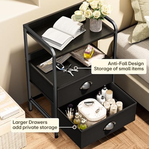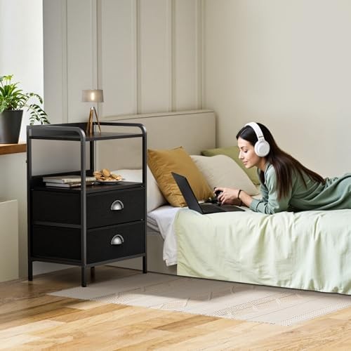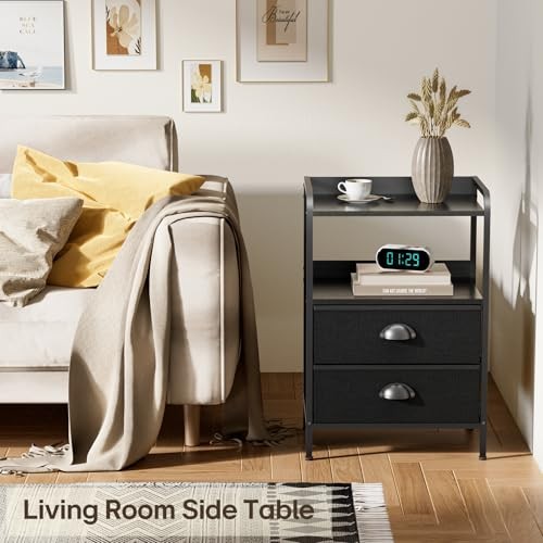 30 Days Return Policy Fast Delivery Trusted seller Nightstand Bed Side Table with 2 Fabric Drawer, End Tables with Open Wood Shelf, Night Stand Dresser for Bedroom/Living Room, Metal Frame, Side Sofa Table with Storage Drawers Product Description Safe Sturdy Night Stand: This nightstand is designed for durability and comes with black wood grain density board, sturdy metal frame, 2 non-woven drawers, and 4 adjustable leg supports. The adjustable feet greatly enhance our nightstand's stability, even on uneven floor or carpet. With the addition of beams for high strength support, wobbly tables are a thing of the past Spacious Fabric Storage Drawers:Our fabric drawers provide ample storage space for your personal belongings (such as remote controls, keys, glasses, or a small amount of clothing and socks) to stay organized. Plus, night stands with drawers, high quality fabric, sturdy and firm,wear-resistant and waterproof Double Display Shelf: The upper and lower wood shelves design provides additional open storage space for table lamps, clocks, photo frames or decorative items on the tabletop. The open storage shelves of the bedroom side tables have flaps on the edges & back to prevent small items from falling. This bedroom end table with spacious desktops that place items wver you like Easy to Assembly: This nightstand is designed for easy installation. You will receive all the parts, an instruction manual and all necessary tools in the package. Parts are clearly coded for installation, just follow the coded carefully, and the entire process should take about 20 minutes Style Stands Out: This end table combining the industrial and rustic design, it is easy to match various scenes, such as bed side tables bedroom, side tables and coffee tables. Overall dimension of this nightstand is 15.76"D x11.03"W x 23.62"H, making it a great fit for small spaces, apartment, kid's room,closets, nurseries, entryways, hallways, playrooms or dorm rooms Shipping Returns Payment Shipping Shipping is FREE to all addresses other than APO/PO boxes in the lower 48 states. All our stock ships from US-based warehouses. Shipped via USPS or UPS (depending on location and package weight) Unless stated otherwise, all orders will ship within 24-72 hours of your payment being processed. Check our feedback to see the great reviews of FAST shipping we offer. Returns As our valued customer, we will do our best to make sure the product you receive arrives to you on time and as expected. If you are not satisfied with your purchase, please contact us within 30 days of receiving your order to process a return. Payment We currently accept payment via eBay managed payments only. Once payment is cleared, we will dispatch your shipment within 1-3 business days. Please refer to the "Shipping" tab for more information regarding shipping speed to your destination.