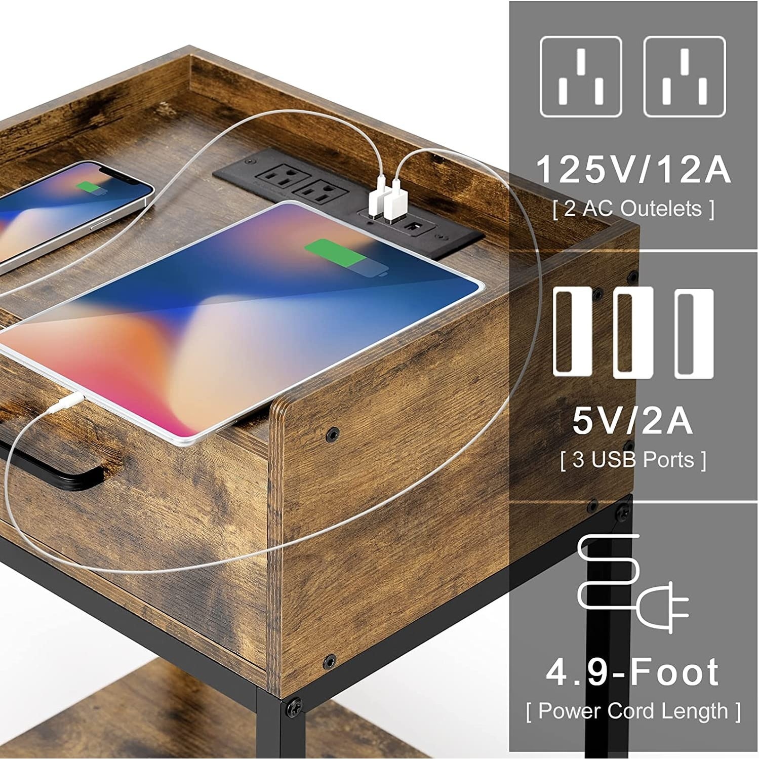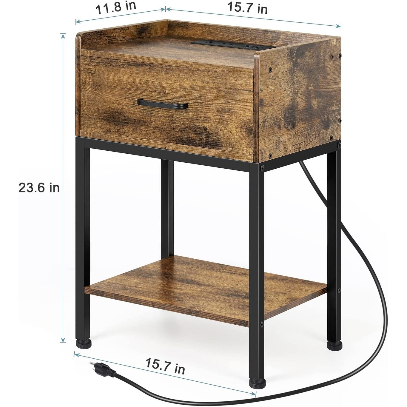 Convenient Charging StationsWe always worry about our phones running low while lying in bed. This nightstand with an electric outlet, built-in 2 standard AC outlets (125Vmax/12A max), 3 USB ports (5V/2A max), and a 4.9 ft power cord is enough for charging needs, it can easily charge your phones, laptops, and tablets or plug in lamp. Sturdy & Durable DesignNo one wants a wobbling small bedside table, our rustic nightstand withstands most items, equipped with adjustable non-slip feet and thickened iron frame design that allows you to place it stably on your bedside or sofa. Meanwhile, prevent the floor from scratches and compact size (11.8W x 15.7L x 23.6H)for small spaces. Safe & Reliable MaterialThe wood nightstand is made of premium MDF and waterproof, rustproof metal. The surface is Free Shipping Over $49.99* Details Nightstand with Charging Station and USB Ports Product Description: Convenient Charging StationsWe always worry about our phones running low while lying in bed. This nightstand with an electric outlet, built-in 2 standard AC outlets (125Vmax/12A max), 3 USB ports (5V/2A max), and a 4.9 ft power cord is enough for charging needs, it can easily charge your phones, laptops, and tablets or plug in lamp. Sturdy & Durable DesignNo one wants a wobbling small bedside table, our rustic nightstand withstands most items, equipped with adjustable non-slip feet and thickened iron frame design that allows you to place it stably on your bedside or sofa. Meanwhile, prevent the floor from scratches and compact size (11.8W x 15.7L x 23.6H)for small spaces. Safe & Reliable MaterialThe wood nightstand is made of premium MDF and waterproof, rustproof metal. The surface is easy to clean, and the materials meet UL, and CARB certified, taking care of your family's health and safety. It is an ideal choice as a gift for your friends or family. Vintage & Practical Furniturethe brown nightstand with a charming retro appearance. It's an elegant piece that complements your home decor. Exquisite drawers and storage shelves give you large storage space for your photos, books, snacks, lamps, etc, as a perfect organization helper for your living room, or bedroom. Easy to AssembleThe manual with numbered parts and clear instructions to help you finish the assembly, just follow it and spends 10-15 minutes on a boring weekend with your kids. (TipCheck all parts before assembly)If there are missing parts or other dissatisfaction, please feel free to contact us)