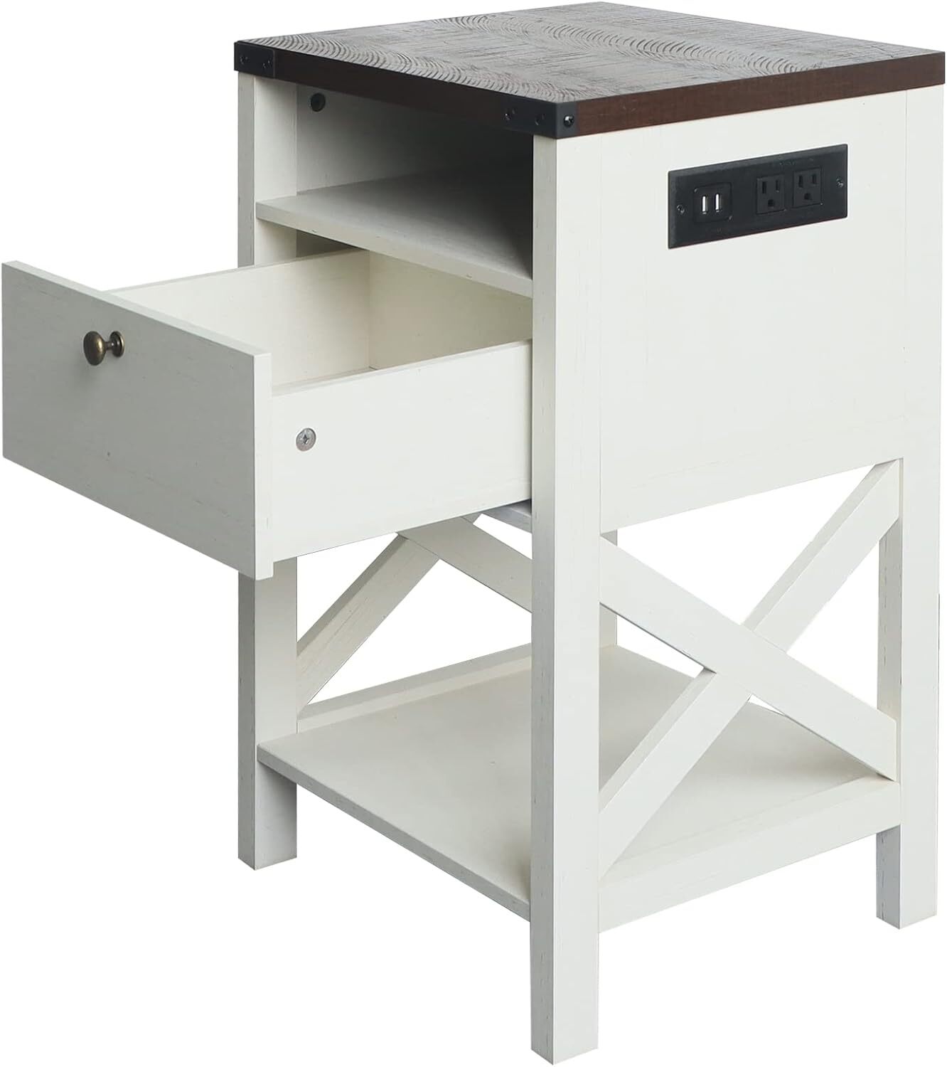 The item was shipped through US Stock, so it arrived faster than expected All ite ms are brand new and unopened, 100% authentic, 24 hours message reply Nightstand with Charging Station, Modern End Table with Drawer, Bedside Table with Open Storage, Vintage White/Espress Color: Vintage White/Espresso Product Dimensions: 14"D x 16"W x 26"H Item Weight :28.6 Pounds Maximum Weight Recommendation: 50 Pounds Frame Material :Engineered Wood, Metal About this item 【Classic Design】This nightstand features X-frame farmhouse accent and industrial style metal corner protection. 【Power by Your Side】Configurable charging station comes with long power cord, two standard A/C sockets and two 2A USB ports which are compatible to most mobile devices. You can choose to place the charging panel on either left side or right side with clear instructions during assembly, and pairing nightstands in bedroom becomes so easy. 【Multi-Layer Storage】Convenient upper shelf provides easy reach space, middle drawer provides concealed and private storage, and large lower shelf provides abundant open storage for decorations even in small space. Layered design helps to organize for each reach at night time. 【High Quality】This nightstand is crafted of premium manufactured wood with high-grade veneer finish in multiple variations. 【Multi Usage】Nightstand at bedside, convenient cabinet, or side table in your living room. Flexibility at your choice. 【Dimensions】16”Width x 14”Depth x 26”Height