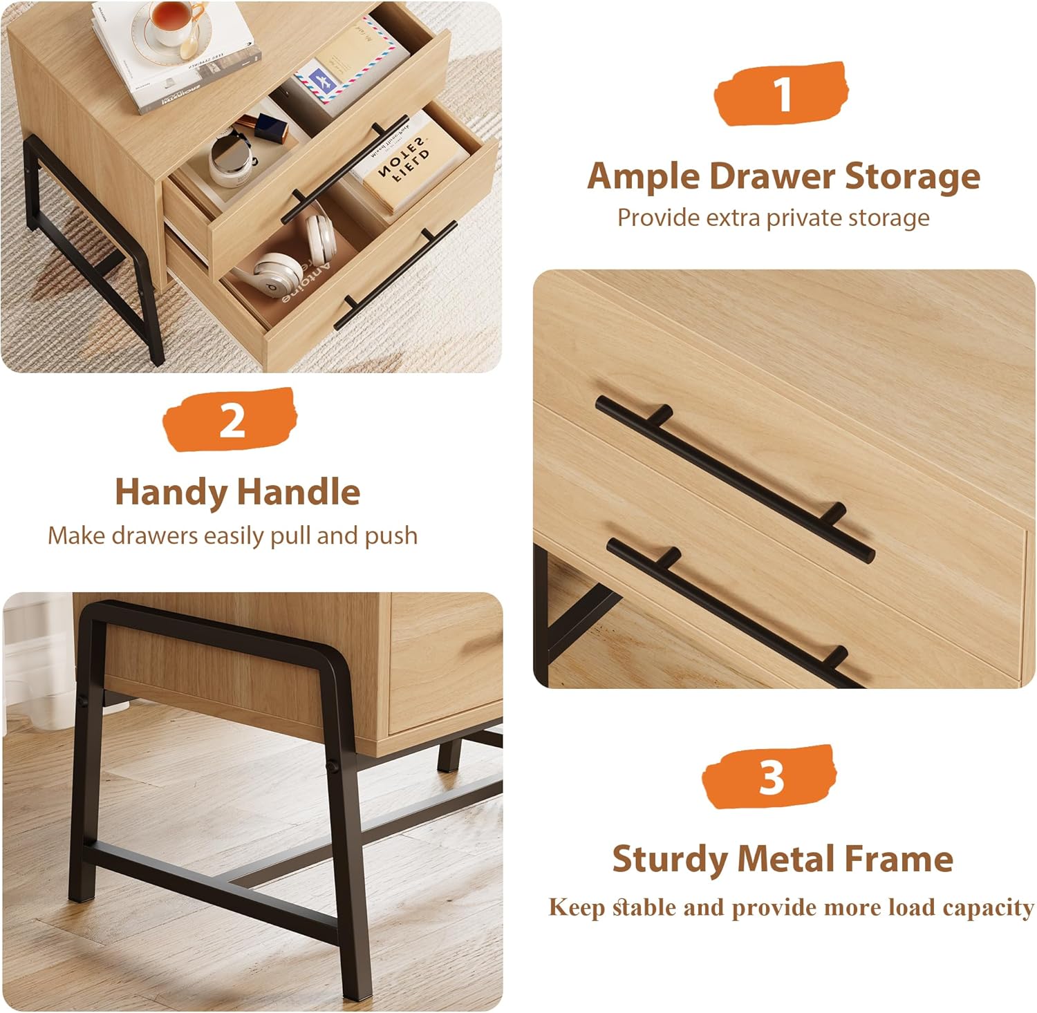 Nightstand with Drawers Bedside Table Storage Table W/ Metal Legs Night Stand Description: —Specifications: Brand: GarveeLife Manufacturer: GarveeLife Product Dimensions: 15.6"D x 23.6"W x 24.3"H Style: Farmhouse Base Type: Leg Item Weight: 37 Pounds Frame Material: Metal Top Material Type: Engineered Wood Shape: Rectangular —Package Included: 1pc Nightstand with Drawers —Feature: [2-Drawer Storage] The dimensions of the drawer are 20.67 "W*11.67" D*4.57" H, which provides a wider and perfect place for private or dust proof items, while the tabletop is ideal for displaying books, decorative items, or keeping frequently used items within easy reach. [Modern Style] This modern nightstand has a light wood color with wood grain patterns on the surface, which provides a rustic yet elegance to your home, creating a cozy and inviting atmosphere. This bedside table fits any decor in your room. The long handles and the unique shape of the metal legs bring outstanding visuals to this item [Sturdy and Durable]This 2 drawer bedside table features thickened metal legs and premium engineered wood for stability. Metal slides make drawers storage more items for daily use. The tabletop can support up to 100 pounds while the drawer can support 25 pounds [Stress-free & Easy to Clean] Our farmhouse coffee table comes with step-by-step illustrated instructions and necessary accessories to help you finish the whole installation effortlessly, the hardware and parts are labeled on each piece for your needs. Besides, the finish repels water and can be wiped clean effortlessly with a damp rag. [Tips] The color of the items in the images might display variance due to factors like lighting, camera settings, and screen disparities. Due to the deviation of different measuring tools, the size shown in the picture may deviate from the actual size by 0.1-0.15 inches. Features thickened metal legs and premium engineered wood, support up to 100 pounds that satisfy your daily need. The dimensions of the drawer are 20.67 "W*11.67" D*4.57" H, which provides a wider and perfect place for items Light wood color with wood grain patterns on the surface, provides a rustic yet elegance to your home, creating a cozy and inviting atmosphere, that fits any decor in your room step-by-step illustrated instructions and necessary accessories to help you finish the whole installation effortlessly Payment Delivery Returns Feedback We accept Payoneer only. All major credit cards are accepted through secure payment processor PayPal. Payment must be received within 7 business days of auction closing. If you have bought multiple items from me, you can send me one payment for all the items instead of paying for them individually. When you click the Pay Now button, eBay will automatically determine if there are other items you have won or purchased from me and will combine them for your review. NOTE: Import duties, taxes and chargers are not included in the item price or shipping charges. These charges are the buyer's responsibility. Please check with your country's customs office to determine what these additional costs will be prior to bidding buying. 1. We will delivery out at the handing time when we receive the payment. 2. The delivery time is 3-5 business days to US by usually time.The parcel maybe delay 1-2day of the weekend.Due to the bad weather,Holidays,Hot Season ect.the parcel maybe delay,If you have any problems,mssage us,we will try our best to solve it. 3. We ship to your eBay address. Please make sure your eBay address is correct before you pay. 4. If you want to change the shipping address,message us before our send out. 5. We cannot deliver your order if your state is PR. 1. If you donot receive the items at the delivery time,the parcel has broken/missing,Please message us before you open case/return,we will try our best to solve it. 2. We offer a 30 day return policy from checkout winning date. 3. An RMA number is required for all returns. Message us for return instructions. Items Returned without a RMA number will not be processed. 4. Items defective upon receipt must be packaged in their retail packaging as if new and returned with a detailed description of the problem. 5. Return shipping fees are not refundable. We reserve the right to decline any returns if the above guidelines are not followed. If you are not satisfied with the item for any reason, please do not quick to leave negative/neutral feedback even open request and case without any communication with us. We devote ourselves making EVERY CUSTOMER in 100% Satisfactory and resolve any problem. Thank you for your understanding and recognition,we are always leave positive feedback to all our customers. Reply: All replies will be sent to your email box, if you do not get response within 24 hours (Sat. & Sun. excluded) please check your eBay My Messages in case that our emails will be filtered automatically by your settings.