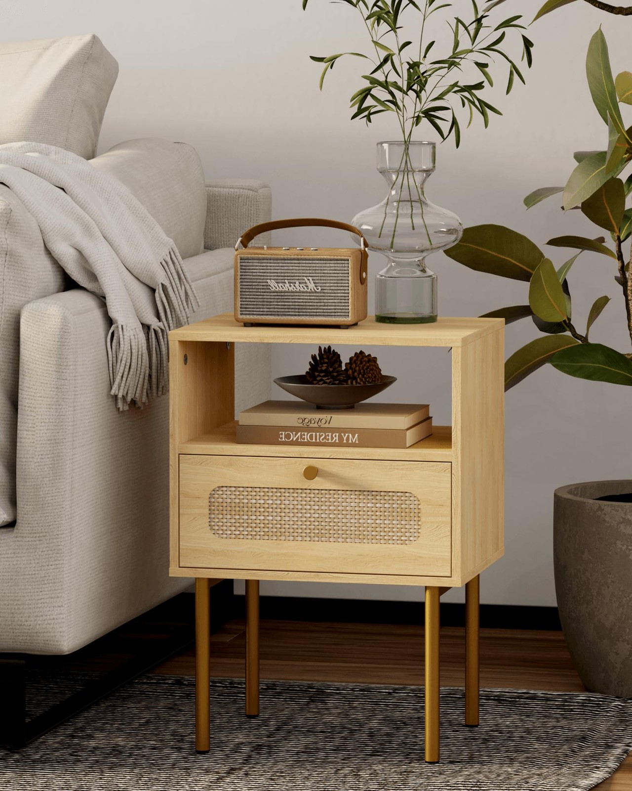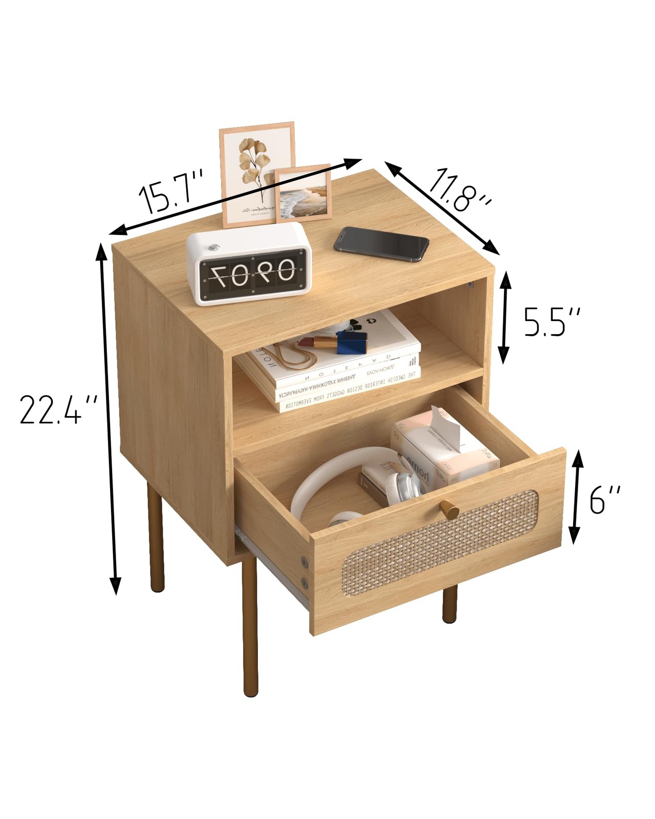 Elegant modern toughened glass style and gold frame, the entire nightstand blends into your modern home environment, you can feel its ubiquitous charm. Love it, use it as a nightstand, side table or end table, and yes, it can blend perfectly together and shine its light everywhere. Its panel is MORU glass, a patterned glass with uneven vertical lines that is transparent but opaque. While protecting the privacy of the interior of the drawer, it also makes the design style more fashionable, with a kind of hazy beauty, letting people indulge in medieval and modern style. Classic with Modern Elements】 Elegant with modern tempered glass style and golden frame, the entire nightstand integrates with your modern home environment, and you can feel its ubiquitous charm. Love it, use it as a nightstand, as a side table or as an end table, yes, it can blend in perfectly and shine its light everywhere. 【Spacious Storage Space】Beside table with Storage Drawer and Open Wood Shelf greatly increases the usable area. You can place ornaments, photos, etc. on the top, books, glasses, remote controls in the hollow space, and some private things in the drawer.everything is so convenient, neat and beautiful! 【Beautiful MORU Glass Door Night stand】 MORU Glass is a patterned glass with uneven vertical lines, which transmits light but does not see through. While protecting the privacy inside the drawer, it also makes the design style more fashionable, with a hazy beauty that makes people intoxicated in the medieval and modern style. 【Sturdy and Durable】Made of high-quality medium-density fiberboard, the surface is scratch-resistant, and the golden iron structure legs are stable, durable and beautiful. Non-slip rubber pads on the bottom of the legs prevent scratches on the floor and reduce noise when moving. This bedside table has a smooth surface for an elegant look, ample storage space and durable performance. 【Easy Assemble and Great Service】The products are equipped with installation instructions and installation videos, and each component is labeled with a serial number. It can be easily assembled according to the instructions. And we have excellent service. If you have any questions, you can contact us directly, including chat.