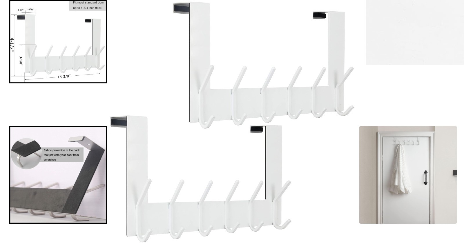 Modern Over The Door Hook Set - Perfect for Coats, Towels & Robes - 2 Pack ‹ › ‹ › ‹ › ‹ › ‹ › ‹ › ‹ › ‹ › ‹ › ‹ › ‹ › Modern Over The Door Hook Set - 2 Pack Transform your space with our elegant Over The Door Hook Set, designed to seamlessly blend form and function in your home. Perfect for organizing coats, towels, and robes, this stylish hook rack is a must-have for any well-appointed entryway, bathroom, or laundry room. Key Features: Overall size: 15-3/8”L x 3-1/4”W x 4-1/2”H Fits most doors from 1 3/8 inch to 1 3/4 inch thick Chic white finish with 6 sturdy hooks Padded with skillful sponge backing to protect your door from scratches Noise-reducing design when closing the door Instant installation – no drilling or hardware needed! Why You’ll Love It: Keep your space organized and clutter-free while adding a touch of modern elegance. The protective sponge backing ensures your door remains unscathed, while the innovative design prevents your items from falling off or scratching. Effortless installation means you can easily enhance your storage options without the hassle of tools or damage to your doors. Ideal for every room, from bathrooms and mudrooms to bedrooms and garages, this versatile coat hanger is essential for efficient organization. Elevate Your Home Organization: Our Modern Over The Door Hook Set is not just a practical solution; it’s a sophisticated addition to your home decor. The sleek design and functional features ensure that both style and usability are at the forefront of your organizational solutions. Enhance your space today with this stylish and practical set. Order yours now and experience the elegance of organized living! Shipping Free & Fast Shipping - We offer free shipping to most of the USA with a normal delivery time of 3-7 days. However, due to the current situation, additional delivery time (up to 3 weeks) may be required for some items. Alternative Carriers - We may use alternative carriers (e.g. USPS, FedEx, UPS, etc.) to ensure your package arrives safely and on time. Due to the use of multiple carriers, we are unable to provide a tracking number automatically. Handling Time - Orders are processed and shipped within 1-2 business days of receiving cleared payment. Shipping Restrictions - Shipping to Alaska, Hawaii, Puerto Rico, Guam, and other US territories may incur shipping charges or delivery restrictions. Please contact us before ordering, or your order can be refunded/cancelled. State Restrictions - There may be restrictions based on your state of purchase. For example, certain items may not be shipped to California due to state regulations. Contact for Tracking Updates - If you require tracking updates or have any concerns about the delivery of your order, please feel free to contact us, and we will be happy to assist you. Return 30-Day Hassle-Free Returns - We want you to be completely satisfied with your purchase. If you are not, you can return the item within 30 days of receiving it for a full refund or exchange. Easy Return Process - To start a return, simply contact us and we will provide you with a prepaid return shipping label and detailed instructions. Restocking Fee - There are no restocking fees for returns. However, the buyer is responsible for return shipping costs if the return is not due to a seller's error. Refund Processing Time - Refunds will be processed within 5 business days of receiving the returned item in its condition. Payment We accept all major credit cards, PayPal, and Apple Pay for your convenience. Your payment information is secure and encrypted to ensure a safe and seamless transaction. Please complete your payment within 3 days of purchase to avoid any delays in shipping. Feedback Your feedback is extremely important to us. We strive to provide the best products and customer service possible. If you are satisfied with your purchase, please take a moment to leave us a positive review. If you have any concerns or issues with your order, please contact us before leaving negative feedback. We are committed to resolving any problems and ensuring your satisfaction. Contact Us If you have any questions or concerns, please feel free to out to our customer support team. You can contact us through the eBay messaging system. We are available Monday to Friday, 9:00 am to 5:00 pm EST, and we will do our best to respond to your inquiry within 24 hours. Buy it now and enjoy a pleasant shopping experience! Unit Quantity: 2 Material: Stainless Steel Mounting: Over-the-Door Department: Unisex Baby & Toddler Theme: Home Storage Features: Easy Installation,Protect Door,Anti-Scratch,Noise Reduction Care Instructions: Easy Care Type: Over-the-Door Hook Number of Hooks: 6 Hook Style: Traditional Item Weight: 2 lb Color: White Style: Modern Finish: White Number in Pack: 2
