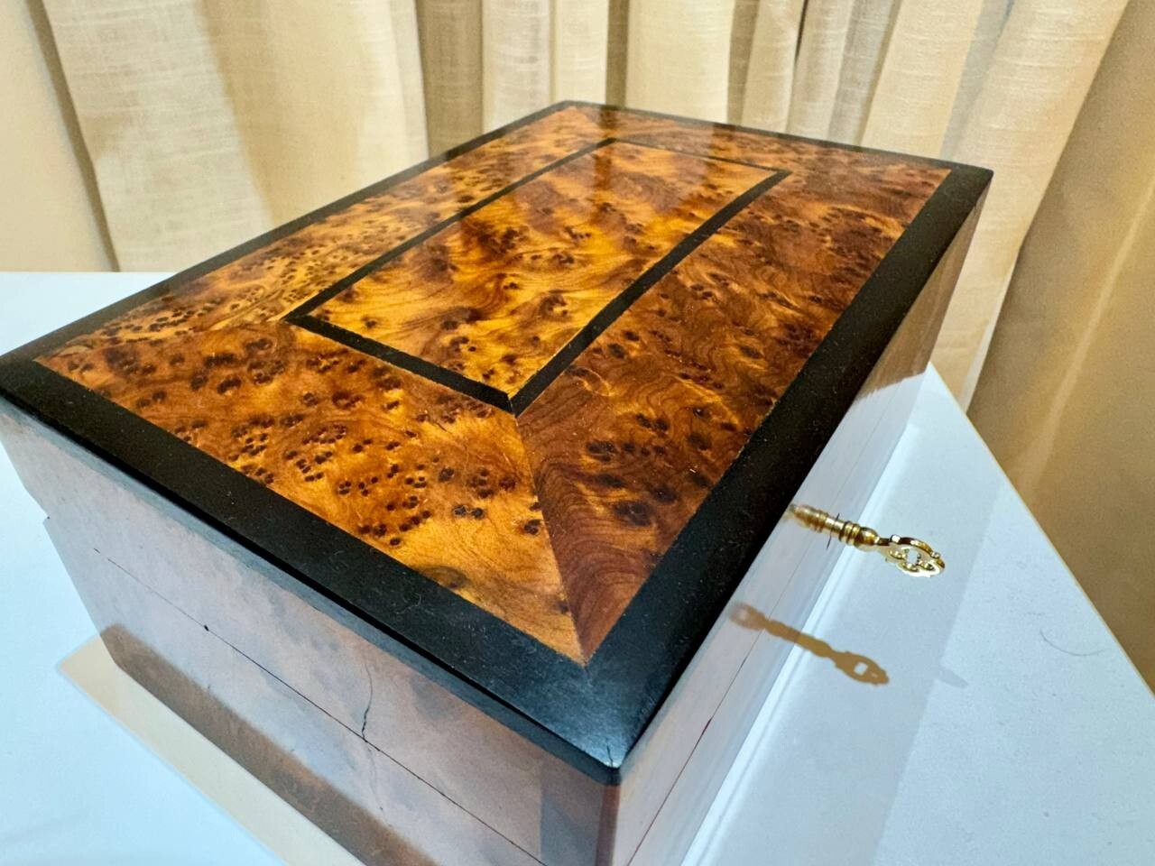 AtlasMuse Handmade Thuya Wooden Box β Crafted with Love by Moroccan Artisans ThuyaCrafts proudly presents its exquisite Thuya wooden box, meticulously handcrafted by skilled Moroccan artisans. Ideal for storing jewelry, cherished belongings, and important documents, this box combines functionality with timeless elegance. π‘ Quality Assured: Each box is crafted using the finest Thuya root burl wood, with careful moisture management to prevent deformation over time. β¨ Key Features: Three separated compartments inside, with spacious storage underneath (Two Storage Levels). Secure lockable design with a brass key. Customization available: engrave/print text on the lid, leather, or velvet interior lining. π Dimensions: Length: 20 cm / 7.9 inches Width: 13.5 cm / 5.3 inches Height: 8 cm / 3.1 inches π Shipping Details: Your order will be shipped within 1 day of purchase, with express shipping delivering in 3-5 business days. Experience the elegance and craftsmanship of AtlasMuse!