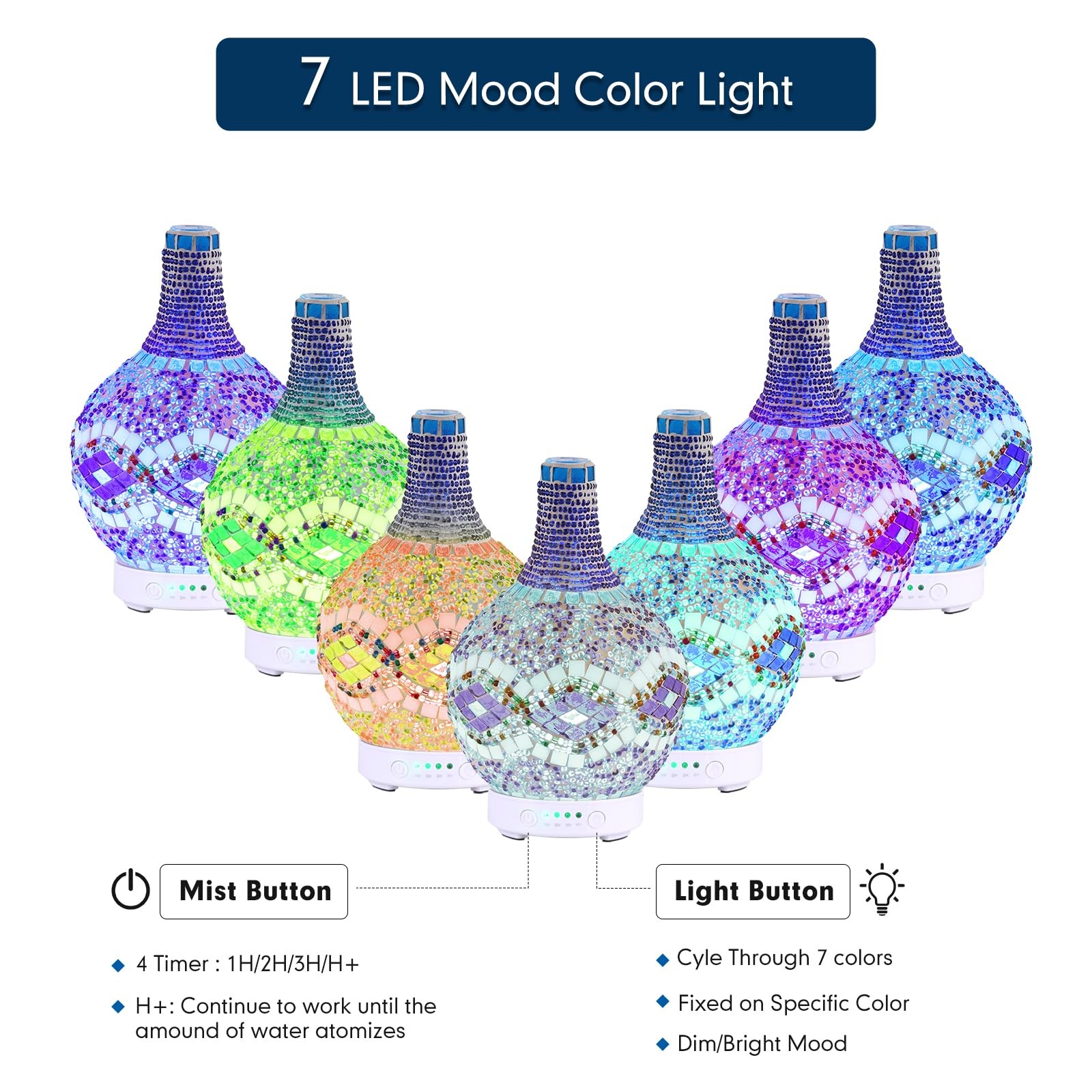 Mosaic Glass Essential Oil Diffuser,Tiffany Aromatherapy Diffuser 100ml Turkish Moroccan Color Changing Aroma Air Diffusers Ultrasonic Cool Mist Humidifier for Sleeping SPA Office Home Turkish Mosaic Artistry: Adorn your space with this beautiful mosaic glass diffuser, handmade with care to deliver a high-end, artistic look. The rhombic pattern adds a touch of sophistication, making it an ideal decor piece for your home or office. Safe and Reliable Design: Made with BPA-free materials and premium glass, this diffuser is safe for your family. The waterless auto shut-off function ensures worry-free use by powering down when the water level is low. Ultra-Quiet Operation: Enjoy a peaceful environment with whisper-quiet ultrasonic technology. Operating at less than 36dB, it’s perfect for relaxing, working, or even putting babies to sleep. Vibrant LED Color Choices: Transform your room’s ambiance with 7 soothing LED colors. Customize the lighting to match your mood or decor, or set it to cycle through all colors for a dynamic display. Perfectly Sized for Any Room: The 100ml tank provides hours of mist, with timer settings (1H/2H/3H/Continuous) that let you control your aromatherapy sessions. It’s compact and versatile, fitting seamlessly into any space. Dedicated After-Sales Service: Our team ensures every product is of the highest quality. Should you encounter any issues, contact us for fast and friendly support to resolve your concerns.