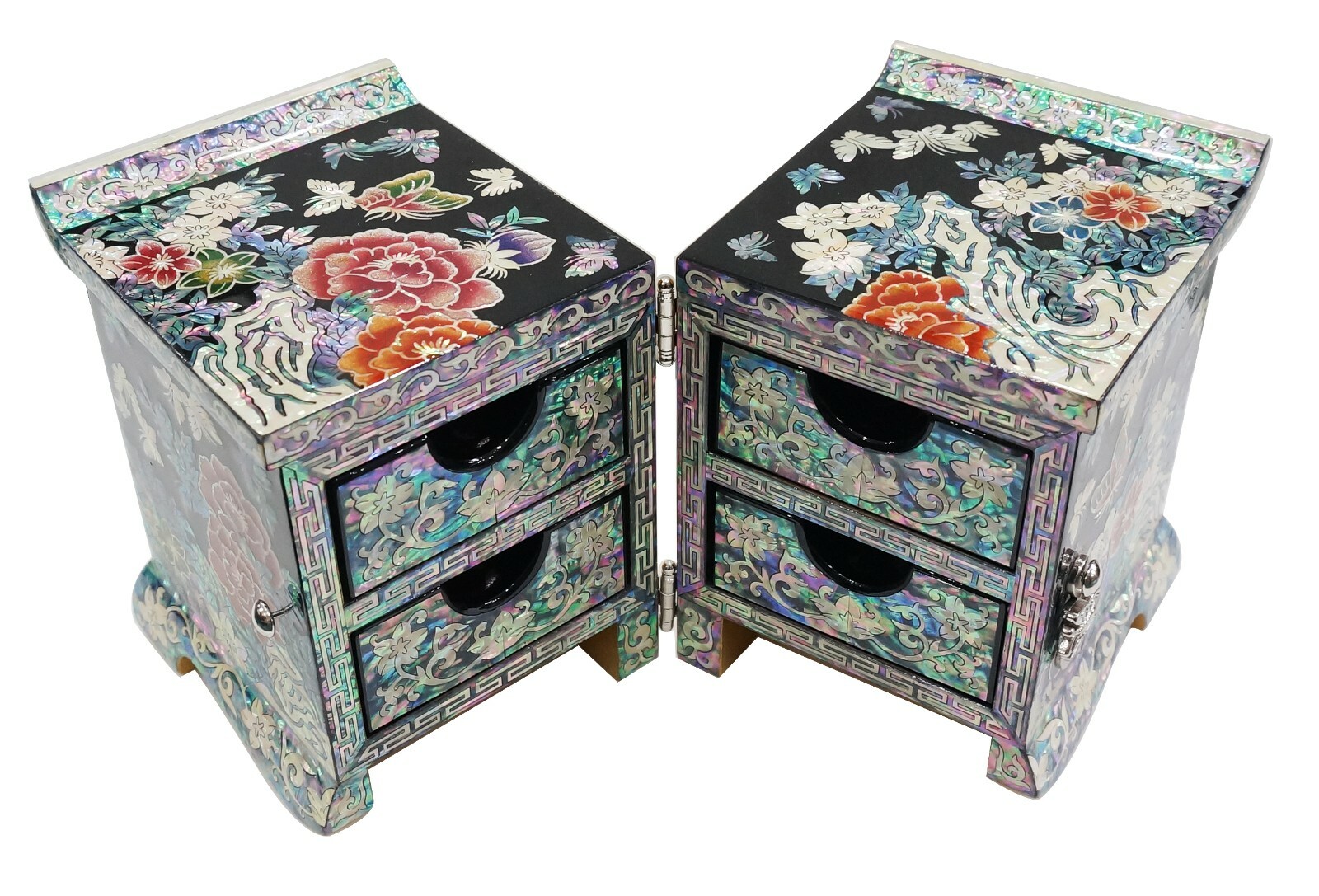 Korean Handmade Mother of Pearl I nlaid Nacre Dual Box 4 Drawer Jewelry Box Ring Necklace Earring Bracelet Brooch Case Storage Chest Trinket Box [Features] • High-end Design and Lots of drawer. • Korean traditional natural handicrafts made by a Master, Mother of pearl inlaid wood, Natural lacquer finish. • Peony and Butterfly patterns symbolize beauty and dignity. • The Best Gift for You and Your Loved Ones. [Specification] • Design: Dual, 4 Drawer • Color: Black • Pattern: Peony and Butterfly • Material: Mother of Pearl (Nacre), Wood, Lacquer, Velvet • Dimensions (LWH): 7.7 x 3.5 x 4.7 in (195 x 90 x 120 mm) • Country of Origin: Korea, South [History and Transformation] The traditional Korean Handmade Mother of Pearl crafts is called 'Najeonchilgi'. It symbolizes eternal love and friendship and wishes for the harmony and prosperity of the family. It is made by craftsman through several manual processes. It is also a work of art that Korean kings and noblemen have loved for more than a thousand years, and today, various designs of Najeonchilgi are still being made. [Shipping] We usually use eGS, eBay's official overseas delivery program. • Standard shipping: 10 ~ 25 working days • Expedited shipping: 3 ~ 10 working days Please check if your address is correct. We only ship to the address listed on eBay. Unpredictable things, including weather conditions, shipping problems, customs policies, etc., can take more time than usual. Please understand. [Customer Support] We aim to provide fantastic purchasing experience and service to all customers with excellent Korean handicrafts. If you have any questions or information you need, feel free to send us a message and we'll answer as soon as possible. [Customer Feedback] Your satisfaction is our goal. Please give us feedback regarding our product and service. Your good feedback is valuable to us. Please help us to serve you better. We will do our best to resolve any issue for your complete satisfaction. [Note] Since these crafts are handicrafts, the design, color, decoration, size, etc. may vary, The color and design of mother of pearl may be different or reversed from the photos, and will be sent randomly. Accessories in the photos are not included and the price is per piece. Import duties, taxes, and charges are not included in the item price or shipping cost. These charges are the buyer's responsibility.