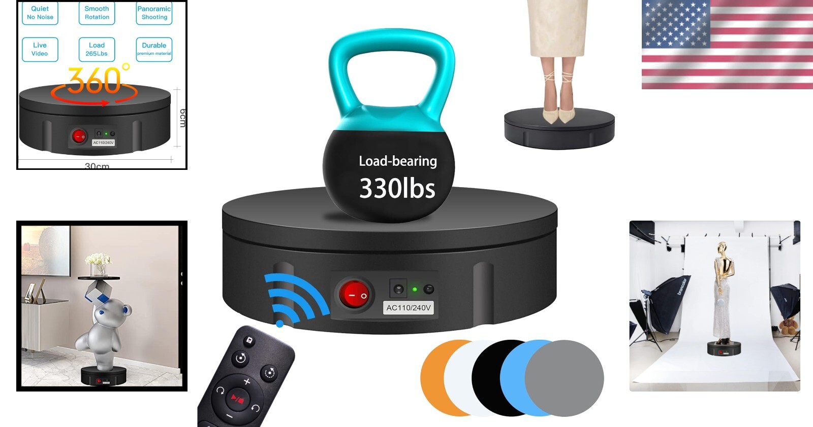 Motorized Photography Turntable - 330 lbs Capacity with 5 Color Backgrounds ‹ › ‹ › ‹ › ‹ › ‹ › ‹ › ‹ › ‹ › ‹ › Motorized Photography Turntable Perfect for the Professional Photographer & Enthusiast Product Highlights: Impressive Capacity: Hold up to 330 lbs, accommodating a wide array of products and displays. All-Angle Visibility: Full 360-degree rotation enables customers to view your products from every angle. Complete Package: Includes turntable, power supply, remote control, and simple instructions for easy setup. Innovative Remote Control Features: Customizable Modes: Adjust angle, speed, and direction with ease. Versatility: Enjoy both clockwise and counter-clockwise turning options, along with continuous and intermittent rotation modes. Position Memory: Save your settings for quick access, allowing you to take photos from every angle with consistent views. Precise Speed Adjustments: Control rotation speed ranging from 22 to 60 seconds per revolution, with 10 gears of speed adjustability. Versatile Applications: Ideal for product photography, still life, live product displays, and video production. Perfect for exhibitions, events, parties, weddings, and 3D scanning. Large size allows for significant product displays in-store or online. Portability and Convenience: Compact Design: Measures 11.8 inches in diameter, making it easy to transport and store. Lightweight: Weighs only 3 pounds for convenient carrying. Universal Power Supply: Compatible with AC110-240 V, ensuring usability in various locations. Why Choose Our Motorized Photography Turntable? Elevate your photography and video presentations with our Motorized Photography Turntable that combines functionality, elegance, and ease of use. Unmatched in quality, this turntable provides the perfect platform for showcasing your products like never before. Step into the future of product display and photography - order your Motorized Photography Turntable today! Shipping Free & Fast Shipping - We offer free shipping to most of the USA with a normal delivery time of 3-10 businessdays. However, due to various situations, additional delivery time (up to 3 weeks) may be required for some items. Alternative Carriers - We may use alternative carriers (e.g. USPS, FedEx, UPS, etc.) to ensure your package arrives safely and on time. Due to the use of multiple carriers, we are unable to provide a tracking number automatically. Handling Time - Orders are processed and shipped within 1-5 business days of receiving cleared payment. Shipping Restrictions - Shipping to Alaska, Hawaii, Puerto Rico, Guam, and other US territories may incur shipping charges or delivery restrictions. Please contact us before ordering, or your order can be refunded/cancelled. State Restrictions - There may be restrictions based on your state of purchase. For example, certain items may not be shipped to California due to state regulations. Contact for Tracking Updates - If you require tracking updates or have any concerns about the delivery of your order, please feel free to contact us, and we will be happy to assist you. Return Please see our ebay return policy. We do not accept return on most products. This is to avoid customers mis-using ebay returns. All sales are final. Please be sure to check the return policy listed at the top of the listing. In rare cases, we may accept returns, if the buyer pays both ways shipping and 20% restocking fee. If you are un-sure of return policy of a particular item, please ask before buying. Payment We accept all major credit cards, PayPal, and Apple Pay for your convenience. Your payment information is secure and encrypted to ensure a safe and seamless transaction. Please complete your payment within 3 days of purchase to avoid any delays in shipping. Feedback Your feedback is extremely important to us. We strive to provide the best products and customer service possible. If you are satisfied with your purchase, please take a moment to leave us a positive review. If you have any concerns or issues with your order, please contact us before leaving negative feedback. We are committed to resolving any problems and ensuring your satisfaction. Contact Us If you have any questions or concerns, please feel free to reach out to our customer support team. You can contact us through the eBay messaging system. We are available Monday to Friday, 9:00 am to 5:00 pm EST, and we will do our best to respond to your inquiry within 24 hours. Buy it now and enjoy a pleasant shopping experience! UPC: Not Set Unit Quantity: 3.52 lb Items Included: Turntable,Power Supply,Remote Control,Instruction Suitable For: Product Photography,Live Product Display,Live Video,3D Scanning Material: Not Set Theme: Not Set Features: Electric Remote Control,360 Degree Rotation,Adjustable Speed,Position Memory,Multiple Angle Circulation Modes Brand: Unbranded Type: Display Stand Color: Black Lining Material: Unlined Shape: Round Department: Unisex Adults Country/Region of Manufacture: Not Set Capacity: 330 Lbs Item Depth: 2.36 in Item Length: Not Set Item Width: Not Set MPN: Not Set Unit Type: lb Vintage: Not Set Handmade: Not Set Personalize: Not Set Customized: Not Set