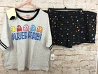 New with tags Pac Man 3 piece pajamas set womens medium Three-piece set includes: T-shirt, boxer short and socks T-shirt: relaxed fit; crewneck; short sleeves graphic at front Shorts: pull-on styling; elastic waistband for added comfort; allover print Includes a pair of coordinating socks T-shirt: 50% Cotton/50% Polyester; Shorts: 65% Polyester/35% Rayon; Socks: 74% Cotton/24% Polyester/2% Spandex Shirt: armpit to armpit: 19 length:22 shorts: inseam: 2" waist across unstretched: 16"-19" stretched
