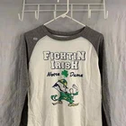 Show off your love for the Fighting Irish with this Norte Dame shirt from M & M. This retro-style t-shirt features a solid white color with blue accents, perfect for any fan of the team. The long sleeve crew neck shirt is made from a comfortable cotton and cotton blend fabric, with a knit texture and a lightweight feel. The shirt is designed with a variety of features, including a full zip hooded design, stretch and quick-dry capabilities, and a double-sided print. It's a limited edition item from the 1990s, perfect for collectors and fans alike. Whether you're wearing it to a game or just showing off your love for Norte Dame, this shirt is sure to be a hit.