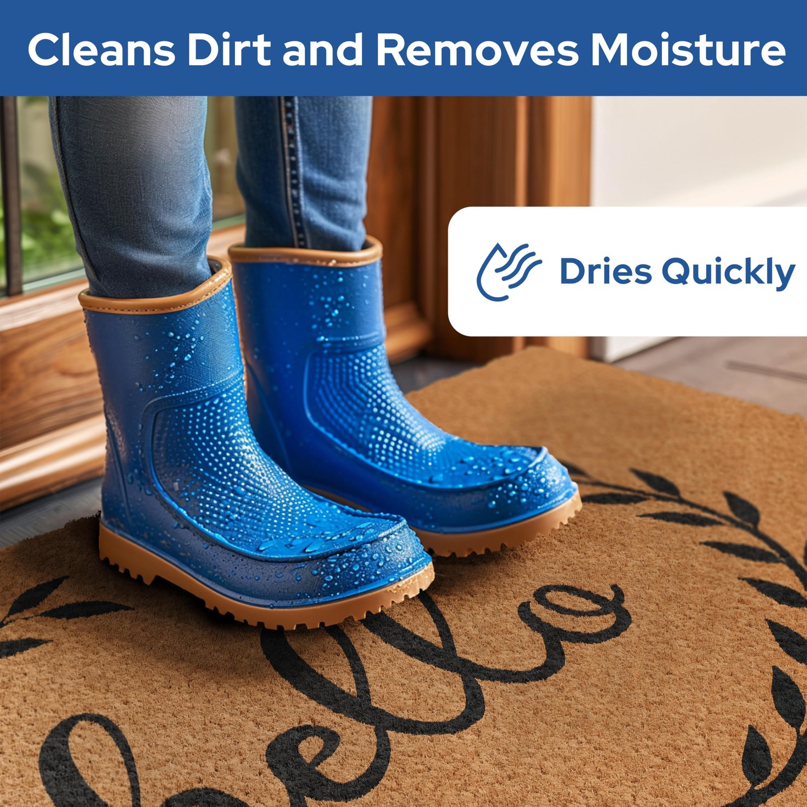 Welcome Front Door Mat, Brown, by : Set this welcome mat at your front door entrance to add a warm and inviting feel to your home sweet home and front door decor. Our 'Hello’ indoor outdoor doormat entrance mat with leaf wreath design is the perfect way to welcome people into your home. This large outdoor doormat is a great option for catching the mess when used as a large front door mat outdoor entrance rug. The indoor front door mat can also be used inside the house, at an interior doorway entrance. Use the welcome mat for front door outside on a porch or patio entrance. The outside door mat makes the perfect addition as a fall front door mat or staged with patio Christmas decor. The outdoor front door mat for home will add a farmhouse touch to your outdoor decor. This outdoor door mat has a non-slip rubber back so it won’t shift or slide. The rubber backing keeps the outdoor mat for front door in place, no matter the weather. Create an inviting aesthetic in your entryway during Christmas, fall, or spring with the extra large outdoor door mat. Our cute farmhouse doormats make lovely fall outdoor mats for the front door. Use this front door rug entrance mat to add a true farmhouse touch to your outdoor front porch decor. Features: Material: Natural coconut coir fibers with PVC backing. Color: Brown/Black. Dimensions: 36" x 0.5” x 24”. Weight: 7.25 lb. A durable front door mat or indoor entrance rug that’s made to last. Please note: Light shedding may occur, as is common with all natural coir mats. Made of Durable Coir - Crafted from 100% natural coconut coir fibers, one of the strongest and most durable plant-based materials. Light shedding is normal with all natural coir mats. When wet, coir fibers may release natural color, which can stain floors or surfaces. This is a natural property of coir. For best results, use a protective undermat, allow the mat to dry fully after rain, and place in a covered entryway or on a covered porch. Say Hello in Style - Welcome guests into your home with our eye-catching Hello Doormat with wreath detail; it’s the perfect indoor or outdoor welcome mat for front door. The doormat’s bold design and large lettering make it impossible to miss, adding a touch of charm to any entryway. Slip-Proof Design - Built with a durable, non-slip backing that helps keep the mat securely in place to prevent shifting when wiping shoes. Provides reliable stability for families, guests, and pets, reducing the risk of slips and movement. The Perfect Size - Measuring 36 x 24 inches, our welcome mat outdoor entrance rug is just the right size for any entryway. It’s big enough to accommodate two people standing side by side, yet small enough to fit in front of a single door without overwhelming the space. It’s the ideal front door mat outside entrance rug for any home or office. Versatile Use - Designed for porches, patios, cabins, RVs, and outdoor gatherings, this coir doormat offers functional durability with decorative style. Thick, coarse bristles naturally scrape away mud, dirt, and debris, keeping interiors cleaner.