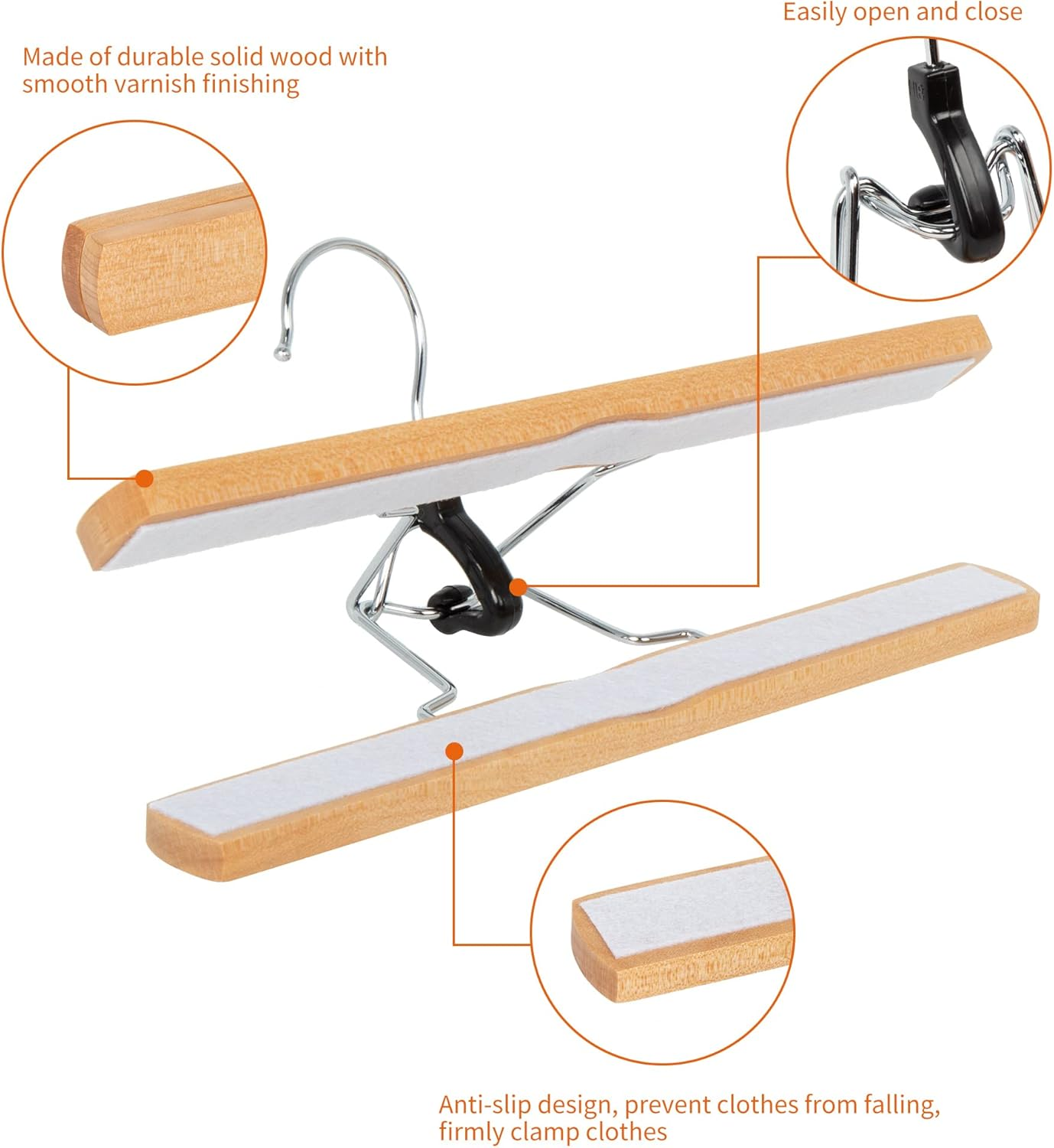 Hanger for keeping pants neatly organized and up off the floor Includes 10-pack of pants hangers Made of smooth durable wood with a natural finish Ideal for trousers, slacks, jeans, leggings, and more Fits most standard hanger rails and closet rods Product Description Amazon Basics Wooden Pants Hangers - Natural, 10-Pack From the Manufacturer Amazon Basics