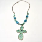 Nes Signed Necklace Cross Pendant. Pendant is 2 1/2 inches long. Enamel teal color with black swirls. Necklace has semi precious stones. I believe they are howlite and jadite. Necklace measures about 16 1/2 inches plus 3 inch extension chain. Quarter is for size reference and not included. Great gift for her: birthday, anniversary, or gift for yourself. As with any jewelry it is a choking hazard for small children. Thank you for viewing this item. Please check out my other listings on Ebay at Kentucky Fun Treasures! I will be happy to combine shipping whenever possible. Thanks!