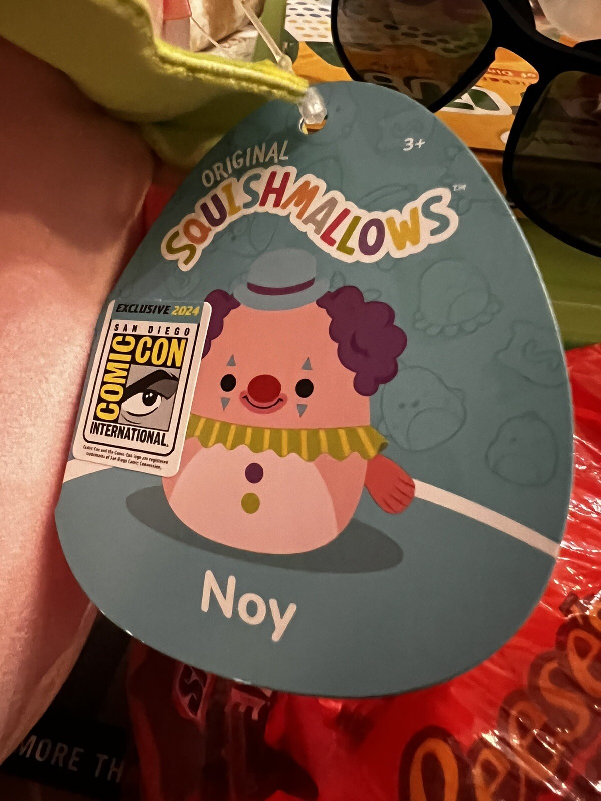 This is a brand new Squishmallow 12" Noy the Clown toy, which was released in 2024 and is a limited edition SD Comic Con exclusive. The toy is medium-sized and has a colorful design with a pink background. It features a clown character from the Squishmallow. In hand and ready to ship!