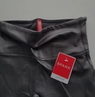 The product is a pair of Spanx Women's Black Faux Leather Shaping Moto Leggings Pants in size small. These leggings feature a low rise waist and ankle length, making them suitable for various occasions including travel, activewear, and casual wear. The faux leather fabric is blended and accented with shaping features, making them perfect for shaping and contouring. With a sleek black color and solid pattern, these leggings are designed for the summer, fall, and spring seasons. Easy to care for, they are machine washable and ideal for walking, dance, and yoga activities.