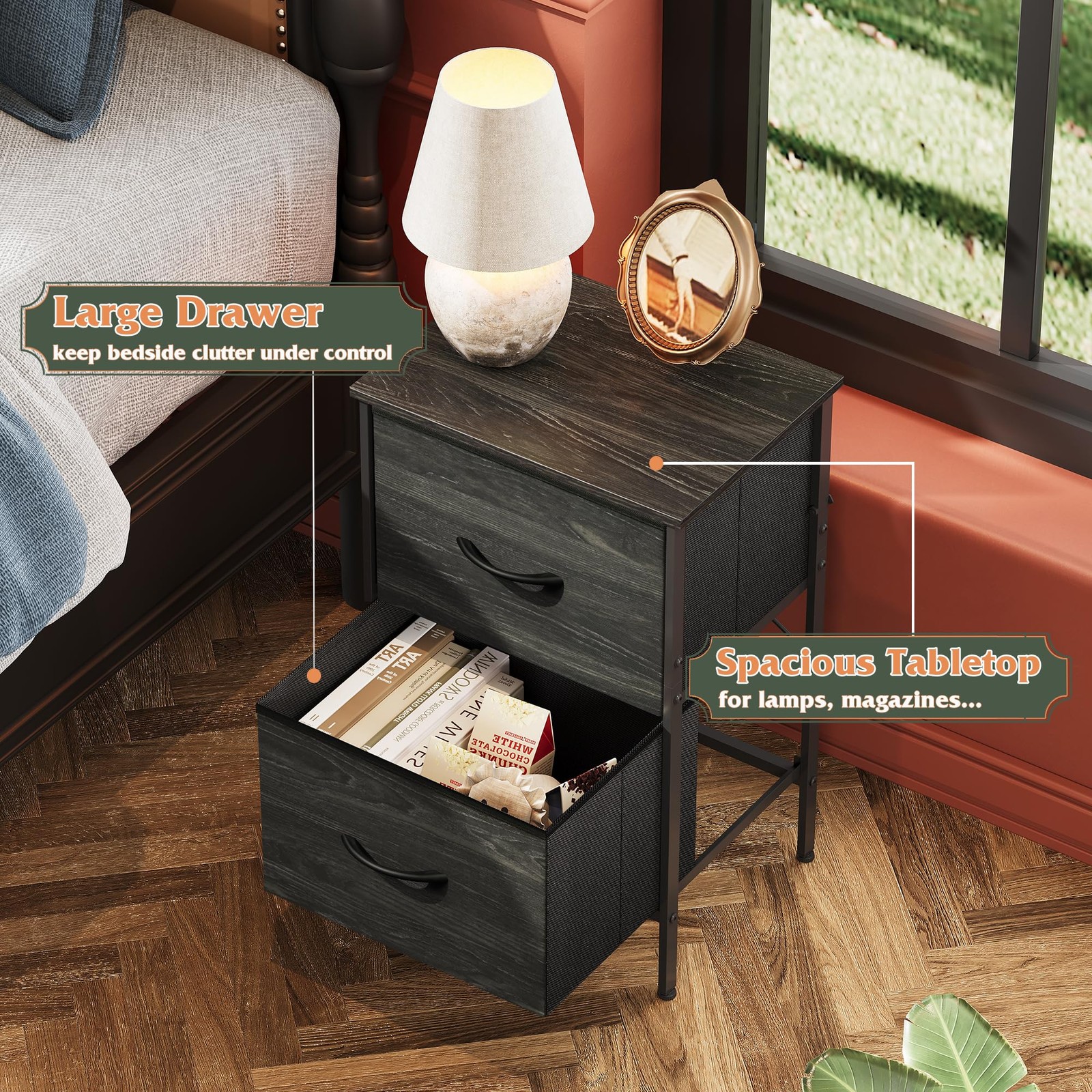 Nightstand, Nightstand with 2 Drawers, Bedside Furniture, Night Stand, Small Dresser for Bedroom, College Dorm, End Table with Fabric Bins, Dormitory, Charcoal Black Wood Grain Print, Size L Multipurpose: This lightweight nightstand is ideal for bedroom, college dorm, living room, office and more. It can be a night stand for bedroom, a convenient end table by sofa or a toy organizer. Spacious Storage: The 2 fabric drawers of the small dresser offer large storage space for nighttime necessities. The wood top is ideal to place alarm clock, phone, charger, eyeglasses, keeping them in your reach. Sturdy & Durable: The nightstand has strong steel frame and water-resistant wooden top to ensure a long service time, easy pull handles to make opening and closing smooth, and 4 adjustable plastic feet to protect floor from scratches. Stylish Design: The simple and modish design of the bedside furniture matches perfectly with any furnishing style. You can find more fabric dressers of the same collection from and make your purchase a bundle. Easy Assembly: The bedside table can be assembled in 15 minutes with the instructions and tools included in the package. The overall dimensions of the 2 drawer dresser: 15.7" L x 11.8" W x 24.9" H.