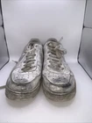 Elevate your sneaker game with these Nike Air Force 1 shoes in a classic white colorway. Featuring a low top shoe shaft style, lace-up closure, and adjustable fit, these sneakers are perfect for both casual wear and outdoor activities. The breathable material and rubber outsole make them suitable for all seasons, whether you're going for a run in the summer or taking a walk in the winter. With a style code of CW2288-111 and a release year of 2021, these Nike Air Force 1 shoes are a must-have for any sneaker enthusiast. They are a standard width and come in US shoe size 12, UK shoe size 11, and EU shoe size 46. The shoes are designed for men and are part of the Nike Air Force product line. Get ready to step up your style with these versatile and comfortable sneakers. Condition can be seen in photos. Has holes in heels on both bottoms. Also has many scuff marks and wear that haven’t been tried to remove.