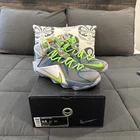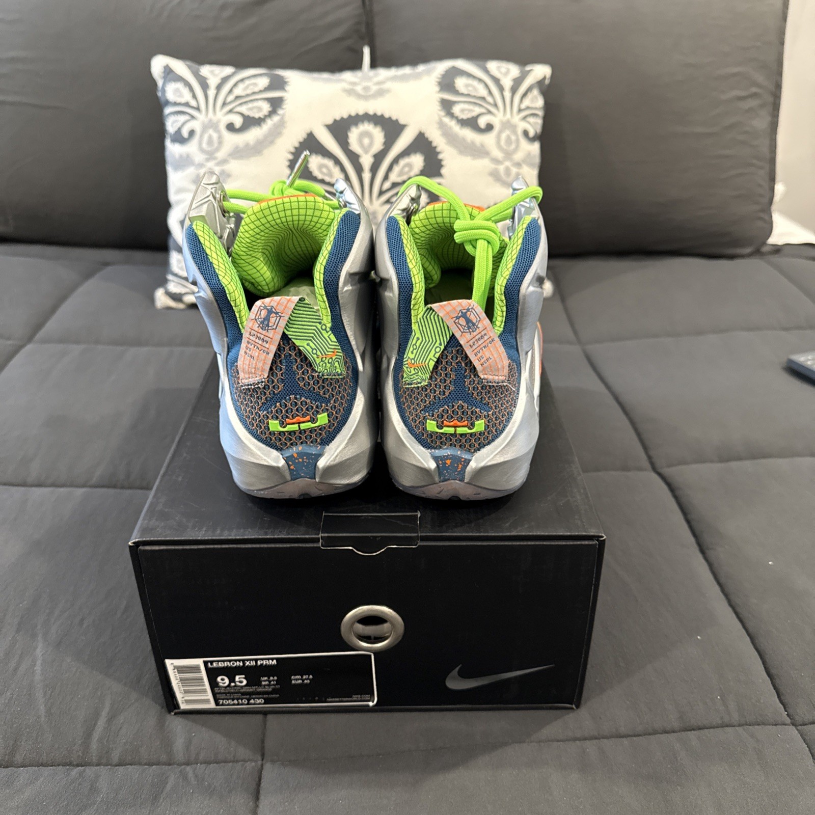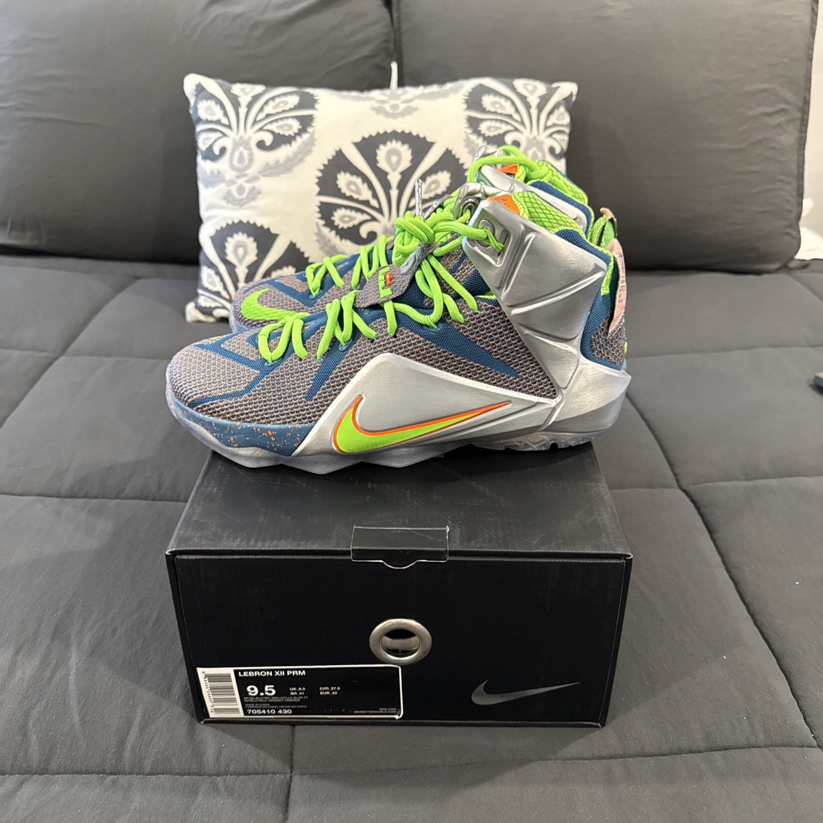 The Nike LeBron XII 12 in Men's size 9.5 is a highly sought-after sneaker featuring a stylish reflective blue, electric green, and silver colorway. Released in 2014 as part of the Nike LeBron product line, this athletic shoe is designed for performance and style. The model is known for its signature design and is associated with the nickname "Trillion Dollar Man." With its premium materials and sleek silhouette, this shoe is a must-have for any sneaker enthusiast looking to make a statement.