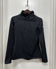 This Nike Pro sweatshirt in size M features a black snake print design, a mock neck with a zip closure, long sleeves with thumb holes, and is made of polyester and spandex. It is a pullover style with the Nike logo accents, suitable for activewear like gym training and running. The sweatshirt is lined with polyester and part of the Nike Pro product line.