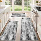 Kitchen Rugs Sets of 3 【100% Non-Slip Silicone Backing】: These 100% anti-slip kitchen runner rugs feature a premium Silicone Dot backing, ensuring stability on tile, hardwood, and laminate floors. Even after repeated washing, the silicone dots maintain strong grip, keeping the rug firmly in place whether in wet, greasy, or high-traffic areas like the kitchen sink, stove, or laundry. Ideal for homes with kids, pets, or elderly family members. 【Abstract 3-Piece Kitchen Rug Set】: Enhance your space with this modern kitchen rugs set featuring an artistic abstract design. The set includes three sizes (20"x32", 20"x48", 20"x59") to fit various areas like kitchen islands, stoves countertops, and entryways. Combining style and comfort, these kitchen mats bring a sleek, contemporary touch to your home. 【Soft, Low-Pile & Durable】: Crafted from soft yet durable materials, these kitchen mat set provide comfort underfoot while withstanding daily wear. The 0.4" low-pile design ensures a sleek look, allows doors to open smoothly, and helps prevent tripping hazards. Designed for high-traffic areas, these rugs for kitchen floor maintain their shape and color even after frequent use. 【Easy to Maintain】: Enjoy effortless cleaning with this machine washable kitchen rugs. Simply toss them in the washing machine, vacuum, or wipe clean to remove stains and spills. The fade-resistant fabric keeps them looking fresh, making these kitchen mats perfect for busy households. (Note: Slight creases may appear upon arrival. Roll in the opposite direction and let it sit for a day to flatten.) 【Versatile for Multiple Uses】: Beyond the kitchen, this 3-piece rug set is ideal for laundry rooms, entryways, bathrooms, and bedrooms. Whether used as a kitchen runner, indoor doormat, or bathroom rug, these stylish and functional mats provide comfort and floor protection throughout your home. An excellent gift for housewarmings, holidays, or special occasions.