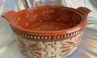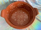 Here is a 2 quart round casserole baker/server with plastic lid and wooden trivet. The floral Old World pattern is in a beautiful dark orange terra cotta color. This hand-painted, hand-crafted three-piece set from Temp-tations, features a 2 quart round casserole baker with plastic lid for storage. It is a stylish and functional addition to any kitchen, perfect for baking and serving a variety of dishes. Casserole is oven, dishwasher and microwave safe. New without box.